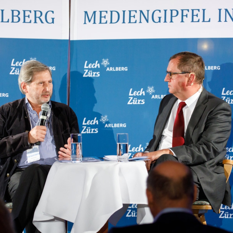 Eröffneten den 12. Europäischen Mediengipfel: Heribert Prantl (Mitglied der Chefredaktion der Süddeutschen Zeitung) und Johannes Hahn (EU-Kommissar für Europäische Nachbarschaftspolitik und Erweiterungsverhandlungen, ÖVP).