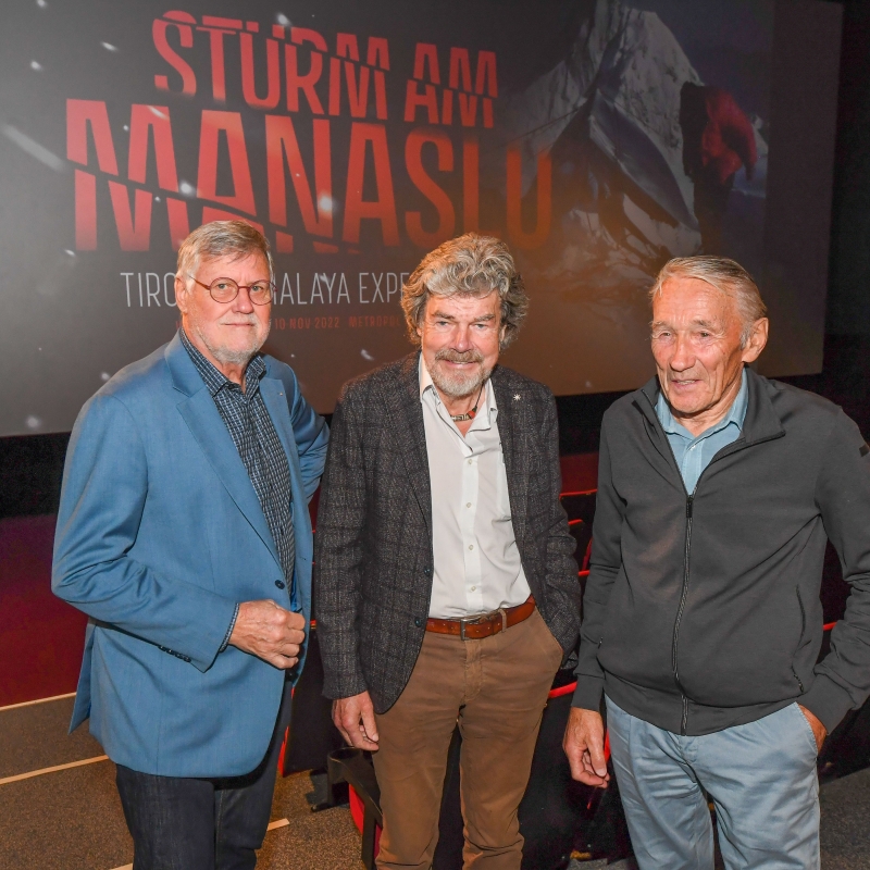 Erzählten zu den Hintergründen des Films "Sturm am Manaslu - die Tiroler Himalaya Expedition 1972": v.l. Wolfgang Nairz, Reinhold Messner und Horst Fankhauser.