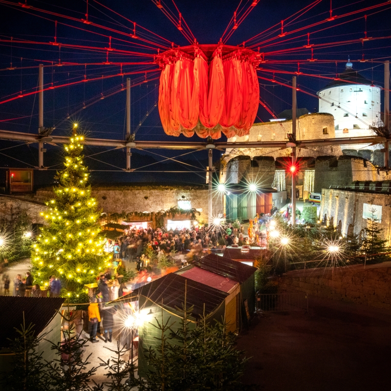 Einen außergewöhnlichen Schauplatz bietet der Christkindlmarkt auf der Festung Kufstein. Zwischen den imposanten Kasematten finden sich liebevoll dekorierte Stände, an denen regionales Handwerk angeboten wird. Für die musikalische Umrahmung sorgen Weisenbläser und Anklöpfler. Im Kufsteiner Stadtpark, der nur wenige Gehminuten von der Festung entfernt ist, findet ebenfalls ein geselliger Weihnachtsmarkt statt: Tiroler Schmankerl, ein abwechslungsreiches Kinderprogramm mit Karussell und Nostalgie-Eisenbahn sowie weihnachtliche Livemusik schaffen hier einen Ort, an dem man gerne verweilt und sich auf Weihnachten freut.