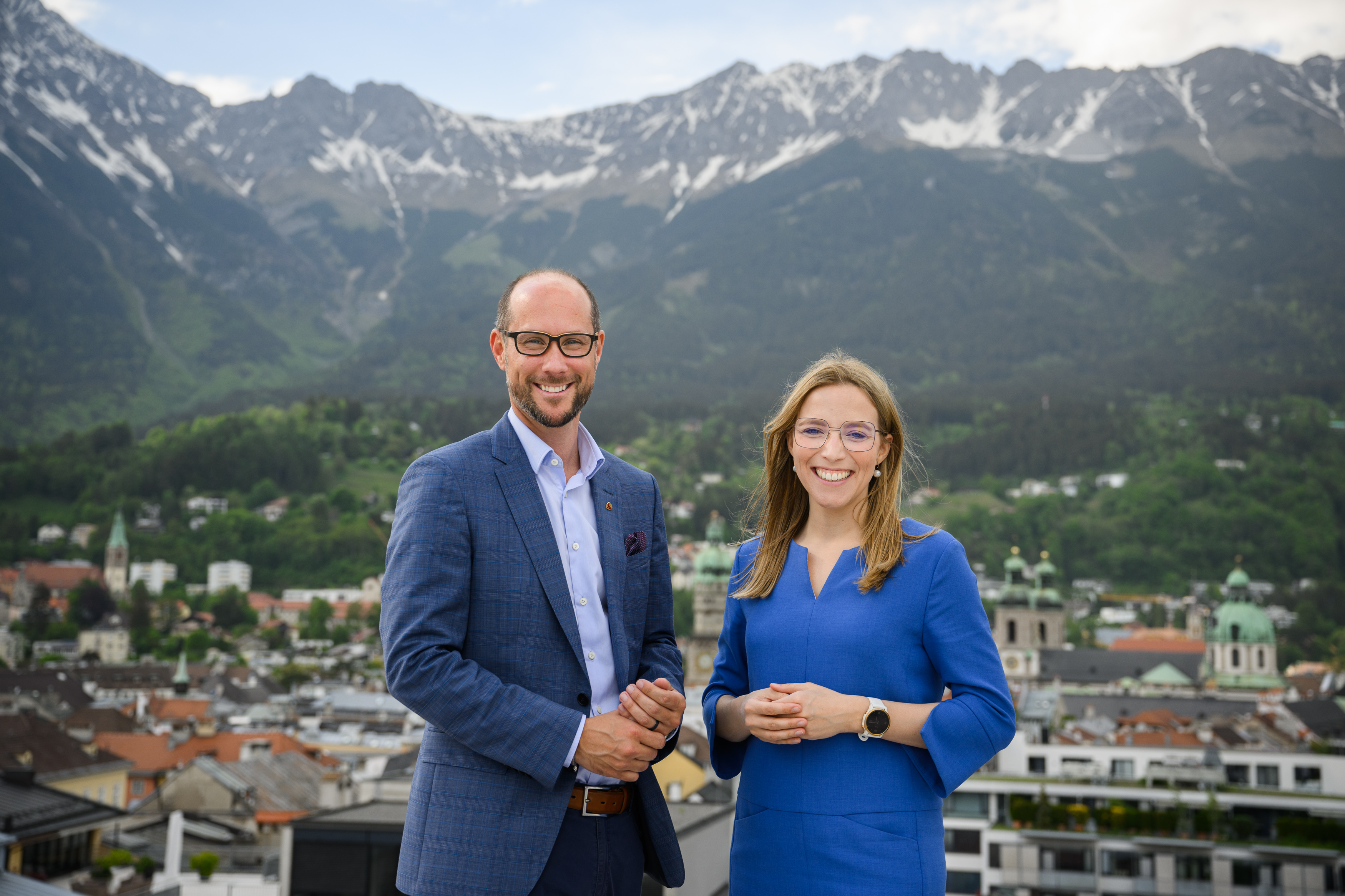 Die 34-jährige Tourismusexpertin Barbara Plattner ist designierte Geschäftsführerin von Innsbruck Tourismus. Obmann Mario Gerber gratuliert.