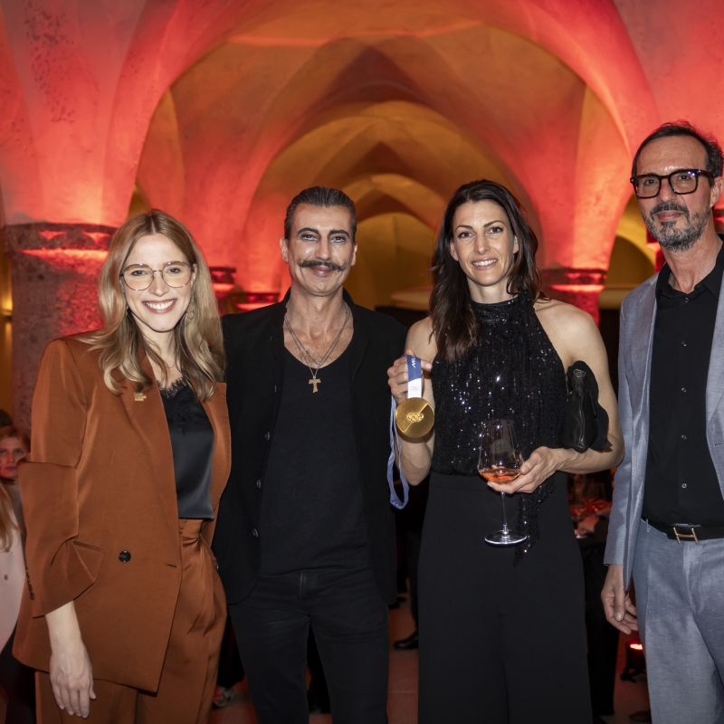 Tourismusverantwortliche und Olympiaheldin wünschen dem Hauptdarsteller Glück (v.l.): Barbara Plattner (Geschäftsführerin von Innsbruck Tourismus), Enrique Gasa Valga, Olympiasiegerin Janine Flock und Peter Paul Mölk (Obmann von Innsbruck Tourismus).