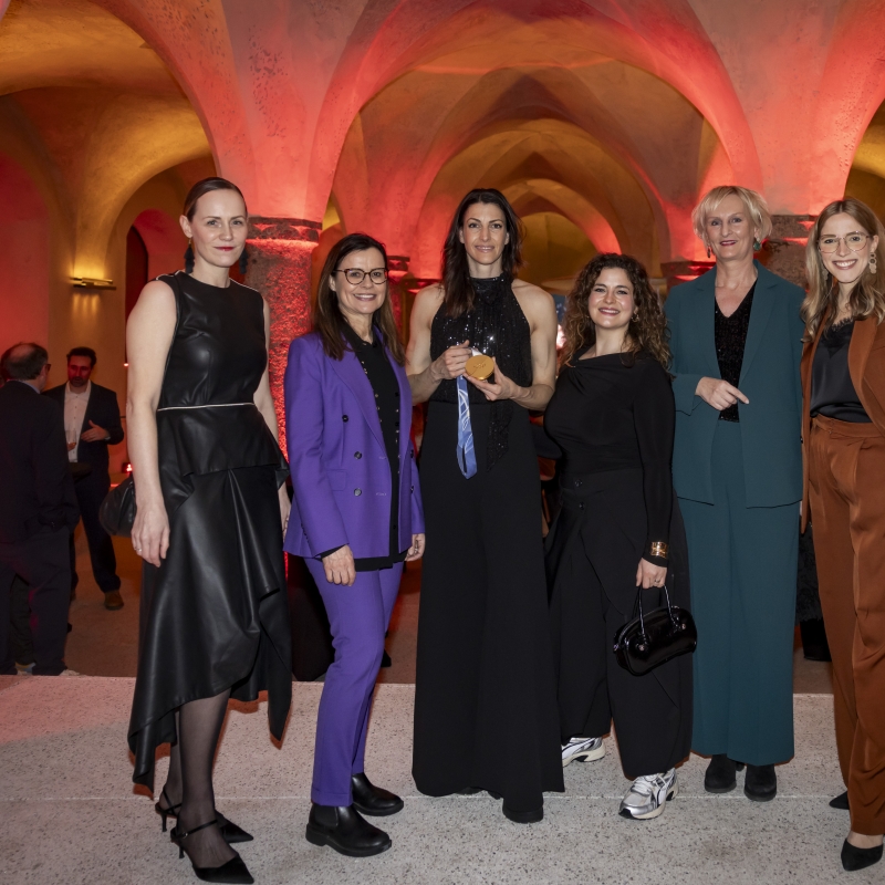 Gratulationen und Ovationen: Obmann Peter Paul Mölk, Olympiasiegerin Janine Flock und Tirol Werberin Karin Seiler (r.).