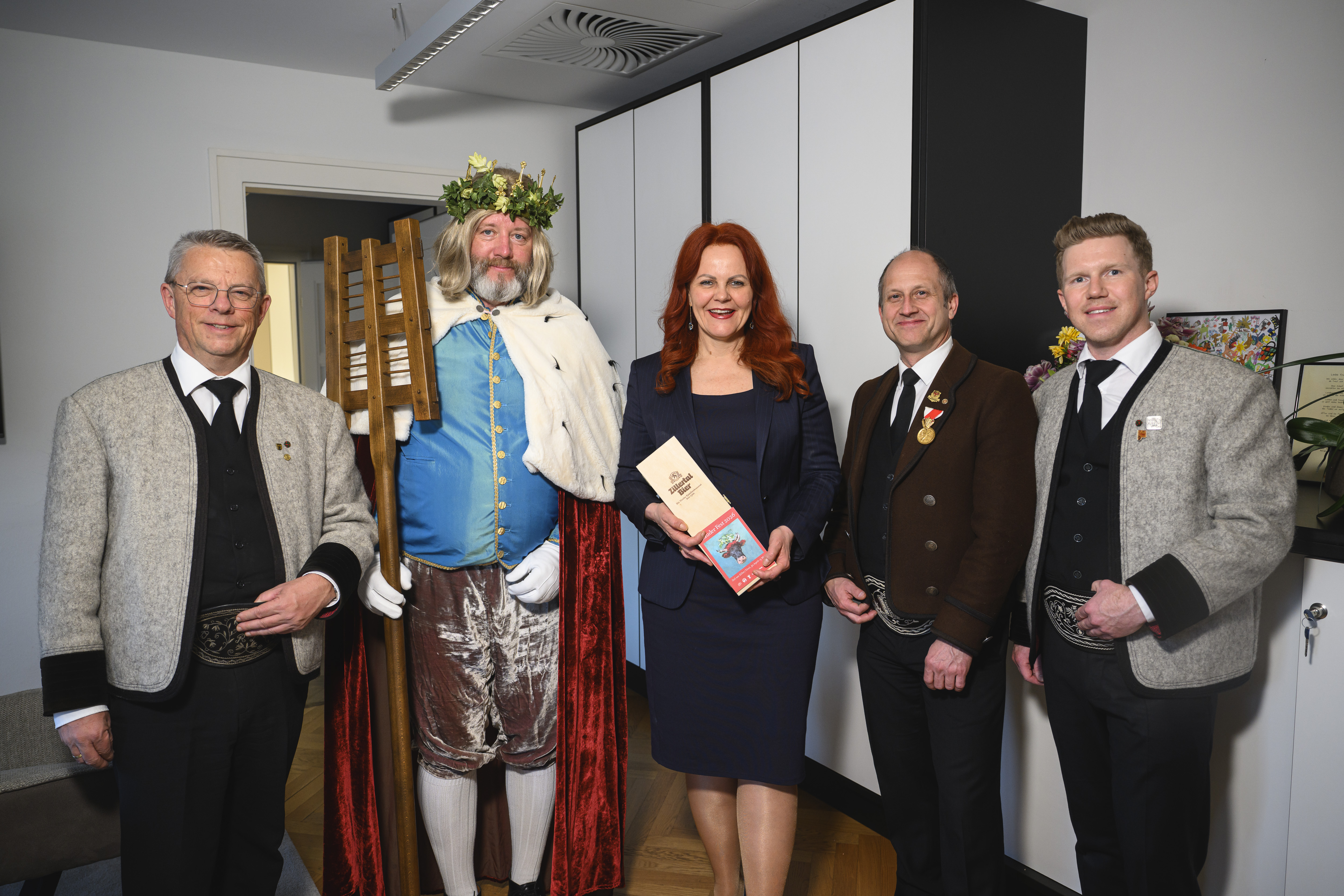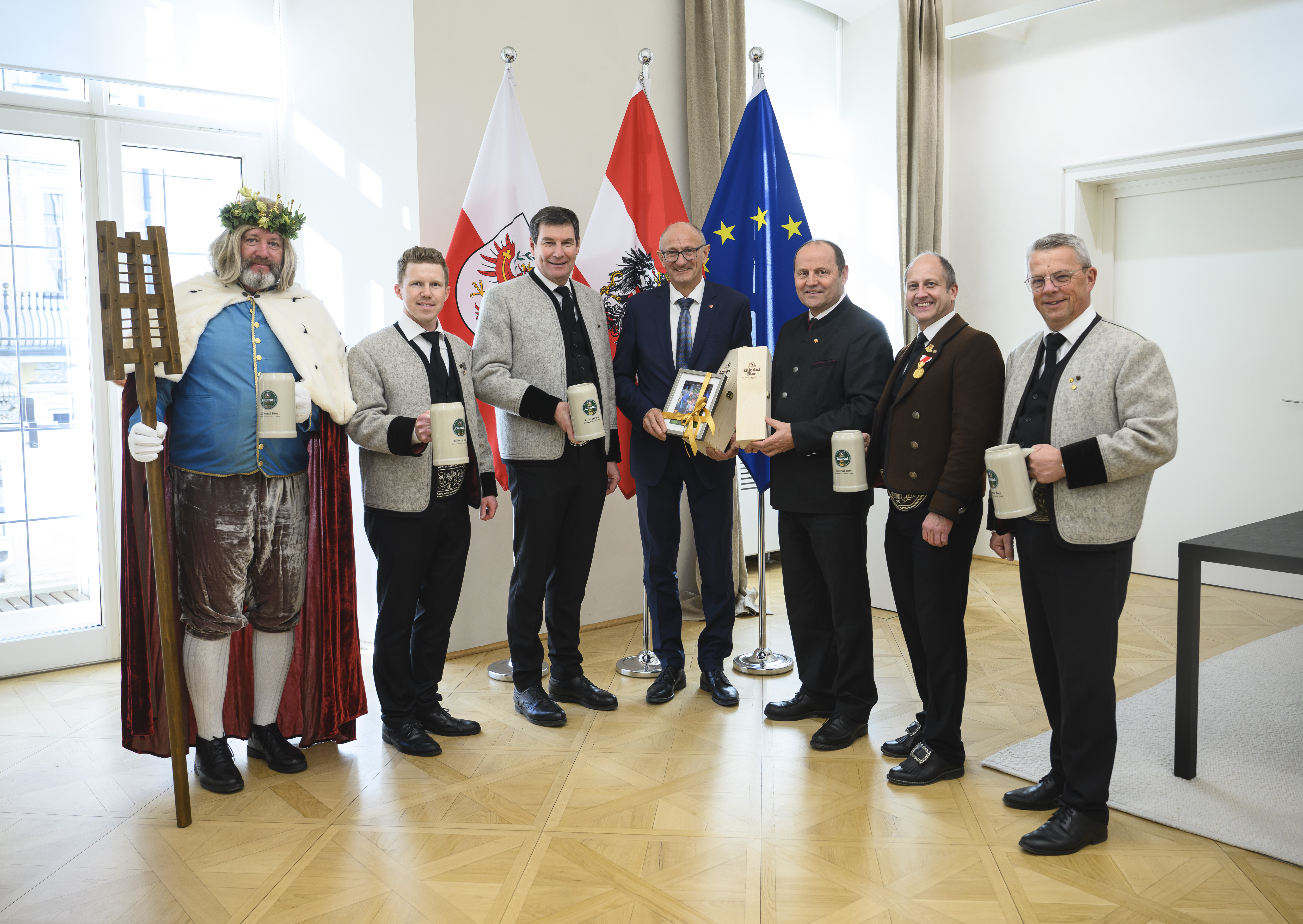 Eine Abordnung, bestehend aus Bierkönig Gambrinus, Martin Lechner (Geschäftsführer Zillertal Bier), Christian Daum (Geschäftsführer TVB Zell-Gerlos, Zillertal Arena) sowie Robert Pramstrahler (Bürgermeister Gemeinde Zell am Ziller) und Alexander Schatz (Obmann Tiroler Landestrachtenverband), überreichte Landeshauptmann Anton Mattle sowie Vertreter:innen der Tiroler Landesregierung persönlich die Einladung zum diesjährigen Gauder Fest.