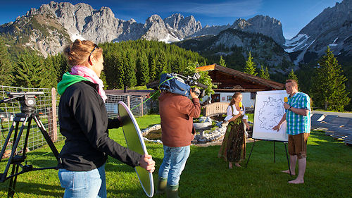 Nach dem donnerstägigen Welcome-Abend in Ellmau – mit Überraschungsvortrag von Europas wohl bekanntestem Wettermann Jörg Kachelmann und Filmpremiere zu Jill Peeters‘ (VTM Belgien) Dokumentarstreifen „Survive the storm“ – wurden am Freitag an den schönsten Locations in Ellmau, Going, Scheffau und Söll aktuelle Wetterreportagen vom Tiroler Bergsommer am Wilden Kaiser gedreht.