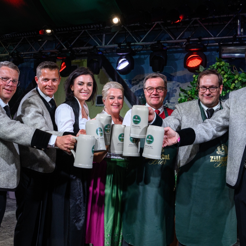 Das Gauder Fest 2022 wurde festlich eröffnet (v.l.): Zeller Bürgermeister Robert Pramstrahler, TVB Zell-Gerlos Obmann Ferdinand Lechner jun., Bundesministerin Elisabeth Köstinger, Moderatorin Johanna Kob, Landeshauptmann Günther Platter, Braumeister Peter Kaufmann und Zillertal Bier Geschäftsführer Martin Lechner.