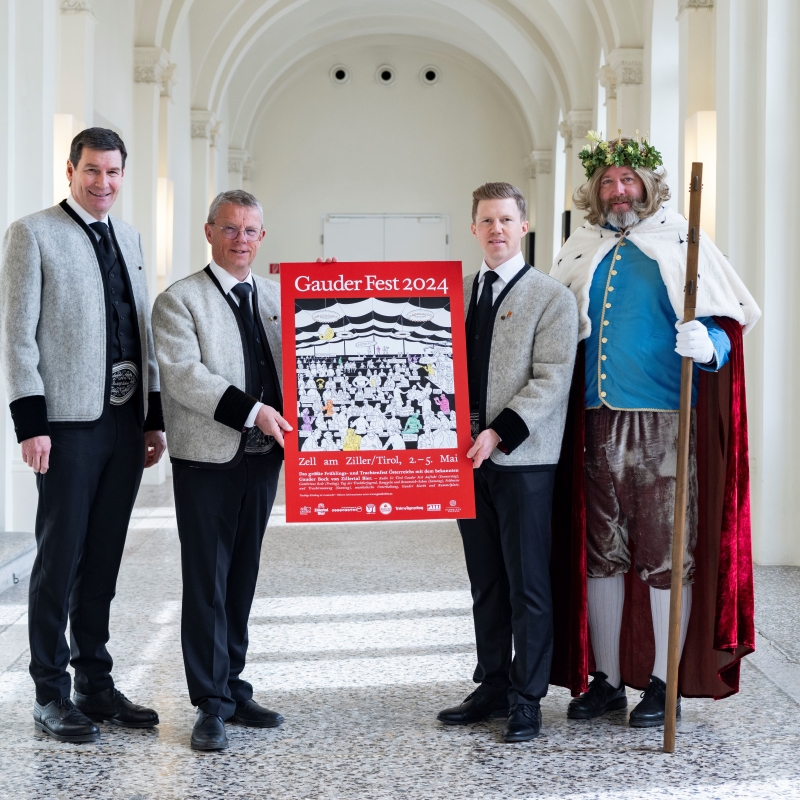 V.l.: Die Veranstalter Martin Lechner (Geschäftsführer Zillertal Bier), Robert Pramstrahler (Bürgermeister Marktgemeinde Zell am Ziller) und Christian Daum (Geschäftsführer TVB Zell-Gerlos) sowie Bierkönig Gambrinus präsentieren das Gauder Fest Sujet 2024.