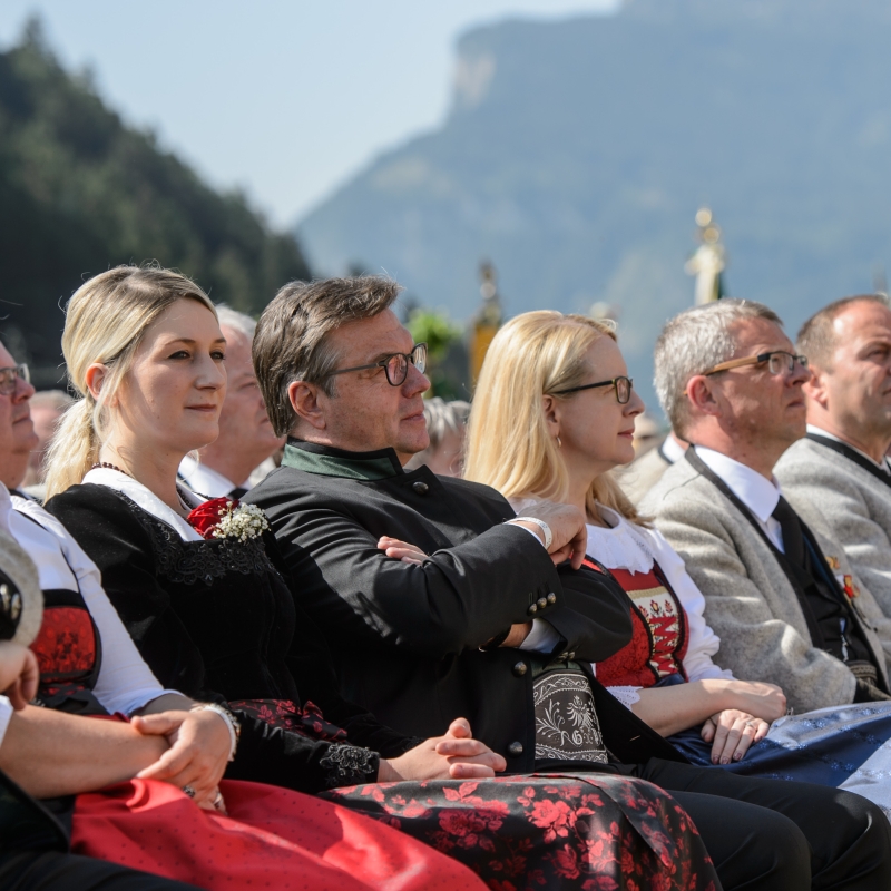 Die Politik bei der Feldmesse: LA Kathrin Kaltenhause, LH Günther Platter, Bundesministerin Margarete Schramböck, Bürgermeister Robert Pramstrahler und LH Stv. Josef Geisler.