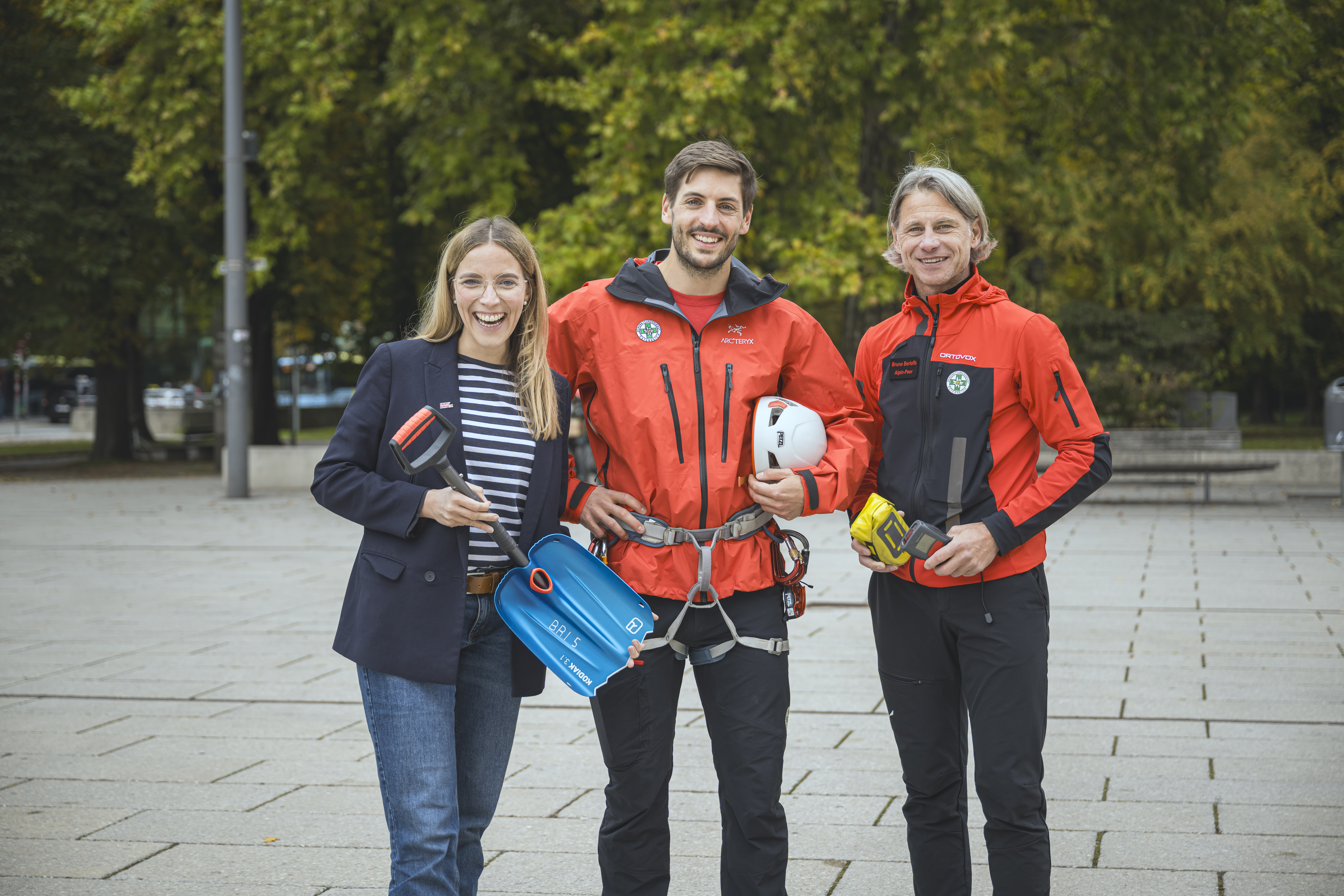 Barbara Plattner (Geschäftsführerin von Innsbruck Tourismus) mit Bruno Berloffa (Leiter der Bergrettung Innsbruck, r.) und Stephan Amstler (Anwärter Bergrettung Innsbruck).