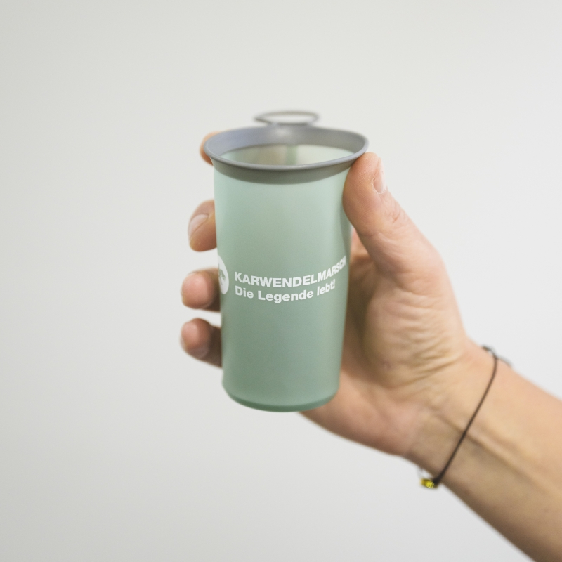 Ein nachhaltiger Faltbecher wurde im Zuge des Pressetermins vorgestellt, der künftig zur weiteren Müllreduzierung bei der Abhaltung des Karwendelmarschs beitragen wird.