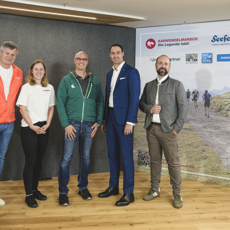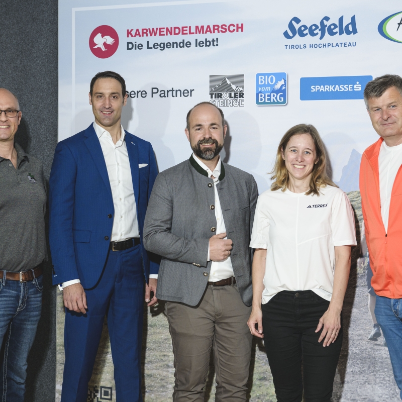 Die Vorfreude beim „Team Karwendelmarsch“ ist groß (v.l.): Martin Tschoner (Geschäftsführer Achensee Tourismus), Lisa Krenkel (Leitung Marketing Tourismusverband Seefeld), Anton Heufelder (Geschäftsführer Naturpark Karwendel), Walter Lackner (Leiter Geschäftsfeldentwicklung, Tiroler Sparkasse) und Simon Wolf (Obmann BIO vom BERG).