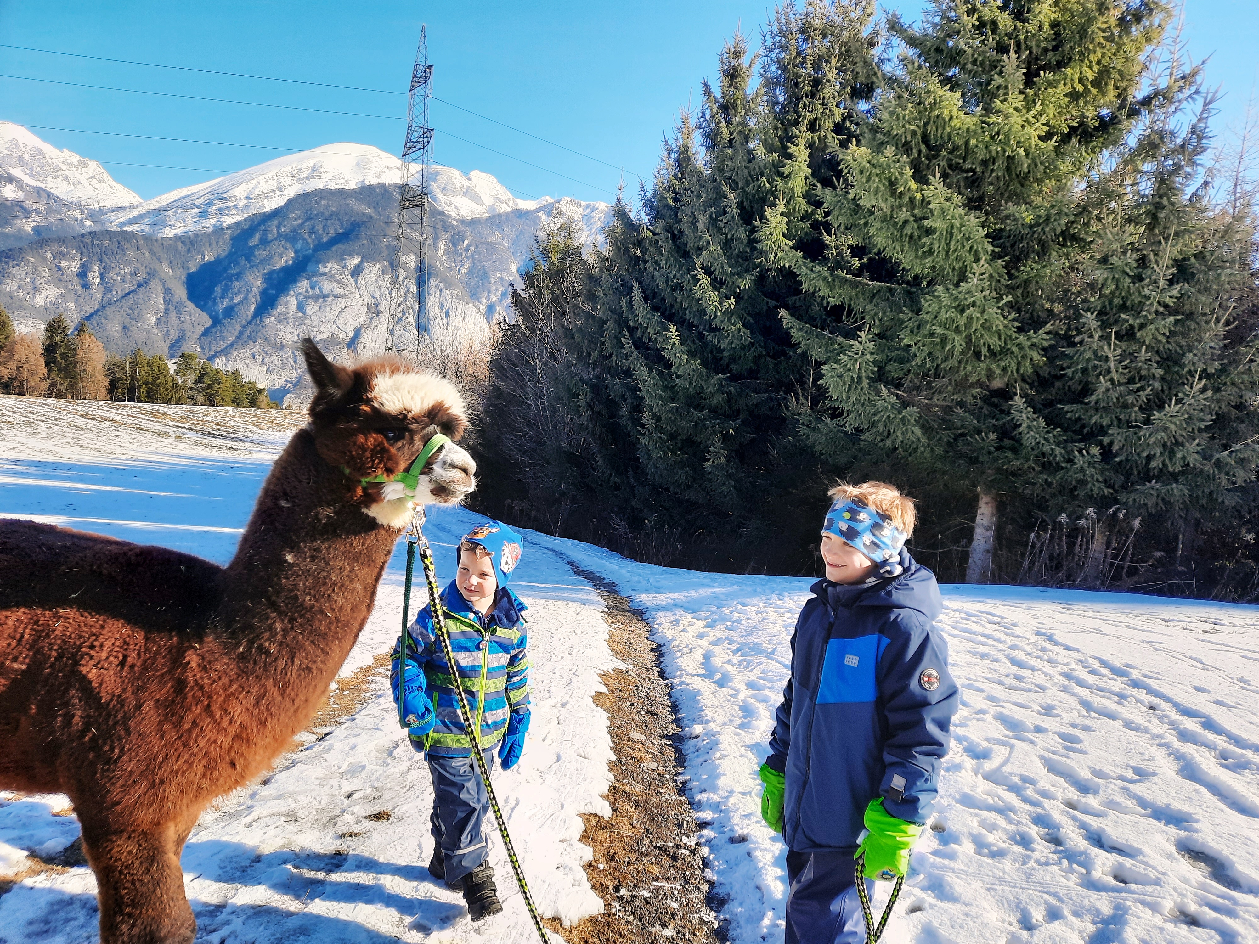 Wandern ist an sich schon eine schöne Sache für die ganze Familie, mit flauschigen Begleitern wie bei der Alpakawanderung in Oberperfuss wird es aber zu einem ganz besonderen Erlebnis. Dieser Ansicht ist auch Elisabeth de Koekkoek, deren Söhne sich sofort begeistert von den Tieren zeigten: „Meine Jungs waren augenblicklich ‚schockverliebt‘, obwohl der Kleine anfangs noch etwas vorsichtig war. Aber als er merkte, wie lieb die Alpakas sind, hat er gleich seine Scheu verloren.“ Doch nicht nur auf die jüngsten Familienmitglieder machte die tierische Eskorte gehörig Eindruck: „Die Augen, das weiche Fell, die langen Hälse – es sind wirklich ganz besondere Tiere“, sagt Elisabeth. „Und sie strahlen eine Gelassenheit aus, die sich auf uns Menschen überträgt. So kann man auch als Erwachsener den Alltagsstress eine Zeitlang hinter sich lassen.“