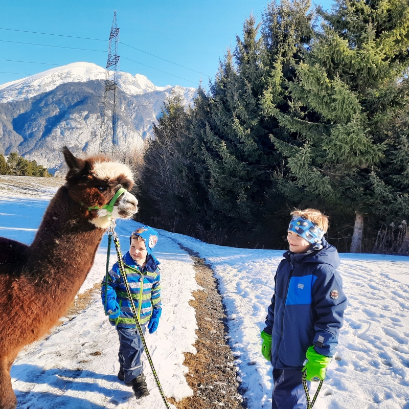 Wandern ist an sich schon eine schöne Sache für die ganze Familie, mit flauschigen Begleitern wie bei der Alpakawanderung in Oberperfuss wird es aber zu einem ganz besonderen Erlebnis. Dieser Ansicht ist auch Elisabeth de Koekkoek, deren Söhne sich sofort begeistert von den Tieren zeigten: „Meine Jungs waren augenblicklich ‚schockverliebt‘, obwohl der Kleine anfangs noch etwas vorsichtig war. Aber als er merkte, wie lieb die Alpakas sind, hat er gleich seine Scheu verloren.“ Doch nicht nur auf die jüngsten Familienmitglieder machte die tierische Eskorte gehörig Eindruck: „Die Augen, das weiche Fell, die langen Hälse – es sind wirklich ganz besondere Tiere“, sagt Elisabeth. „Und sie strahlen eine Gelassenheit aus, die sich auf uns Menschen überträgt. So kann man auch als Erwachsener den Alltagsstress eine Zeitlang hinter sich lassen.“