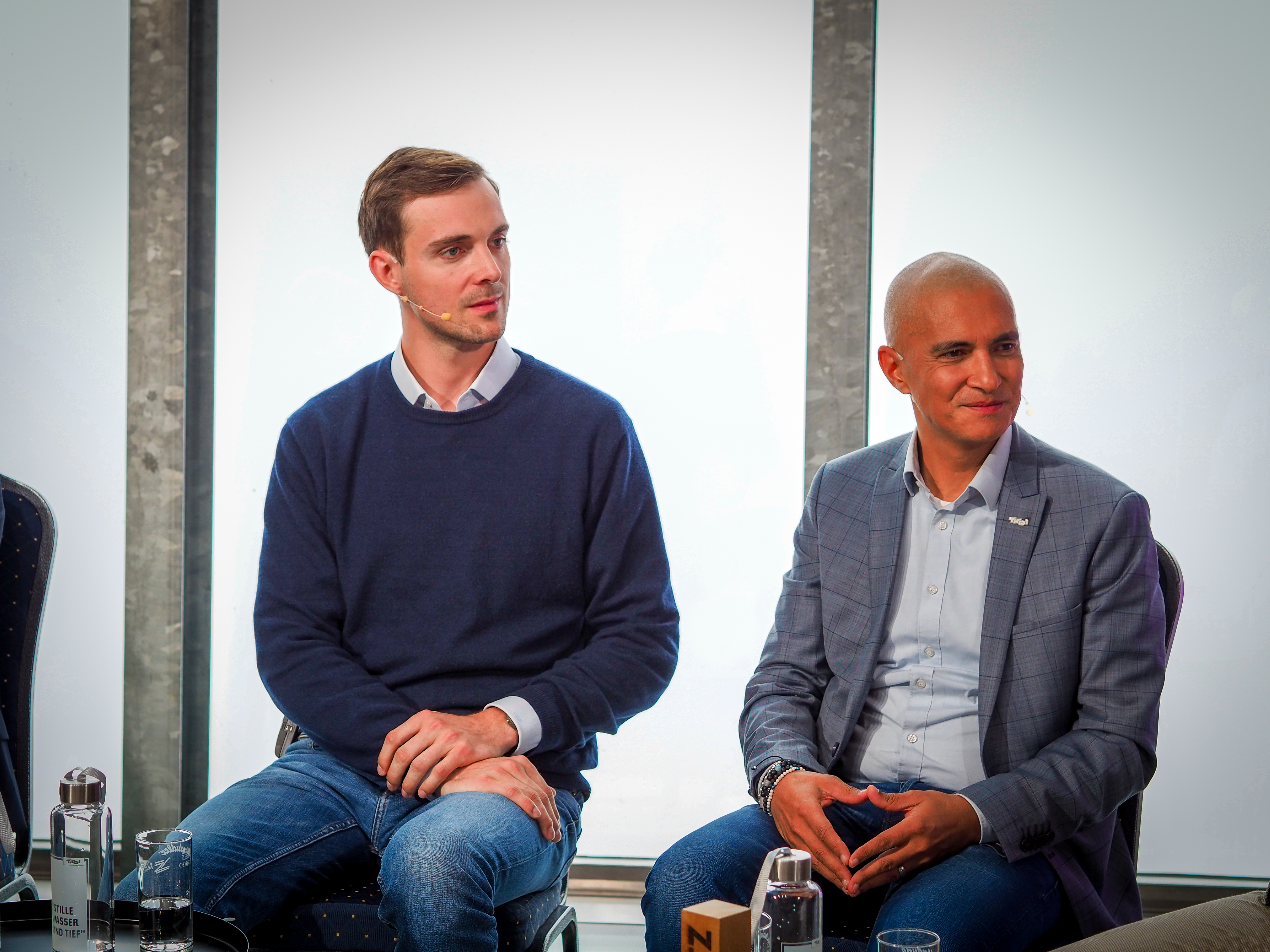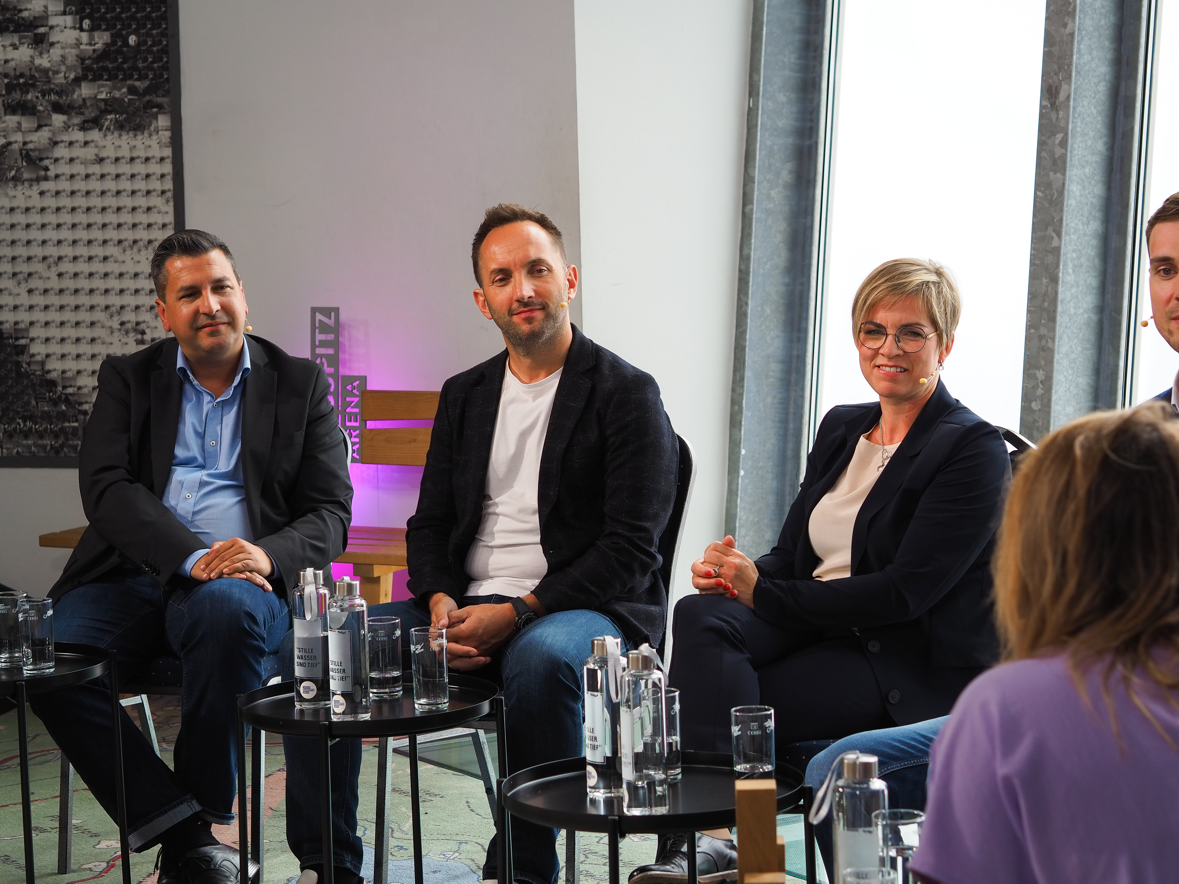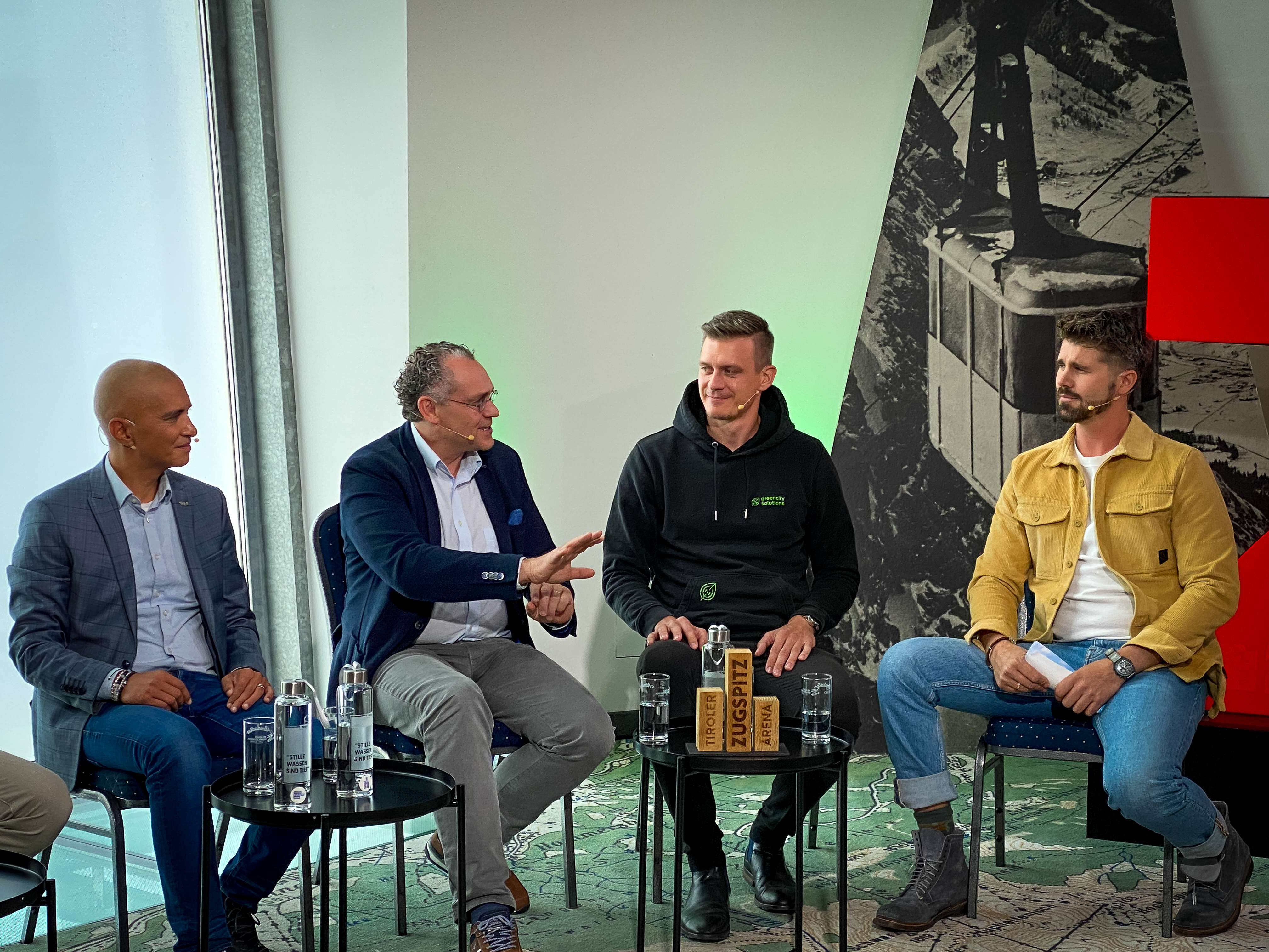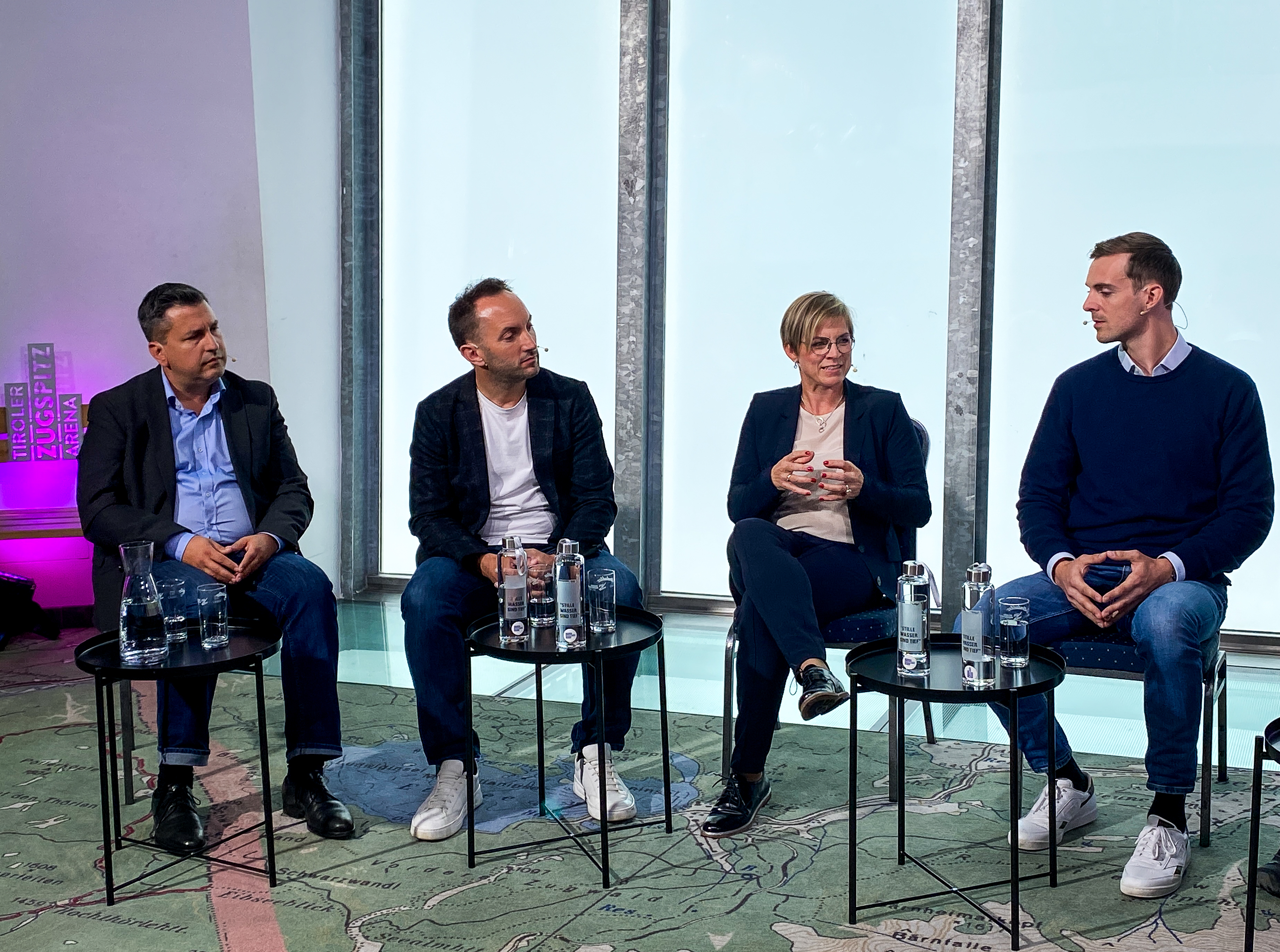 Patricio Hetfleisch (Marketingleiter Tirol Werbung, l.) und Philip Krammer (CEO Terawind) im Öko-Talk mit Moderatorin Verena Schneider.