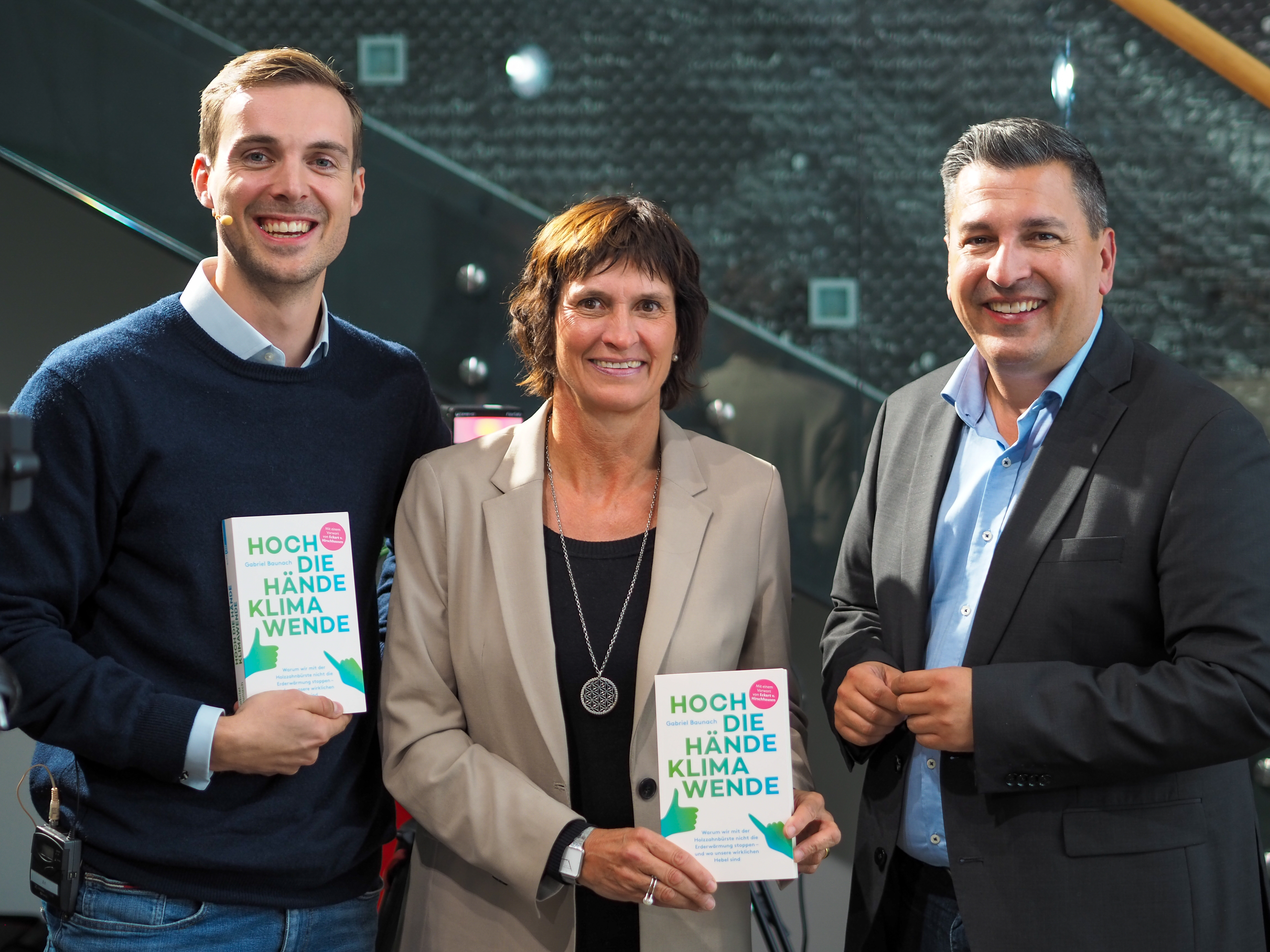 Buchautor Gabriel Baunach („Hoch die Hände, Klimawende“) hielt ebenfalls ein Plädoyer für ein gemeinsames Handeln. Der ökologische Fußabdruck sei wichtig, aber durch das Konzept des Handabdrucks zu ergänzen. Dahinter stehe die Idee, dass sich mit konkretem individuellem Handeln eine viel größere Wirkung erzielen lasse als mit persönlichem Verzicht. Verhaltensänderung sei wichtig, aber ungenügend für die Minderung des Klimawandels, solange sie nicht eingebettet sei in strukturelle und kulturelle Veränderung. „Um es mit Hannah Arendts Worten auszudrücken: Wenn Menschen zusammenkommen, um gemeinsam zu verändern, dann kann man durchaus mit Wundern rechnen“, so Baunach.