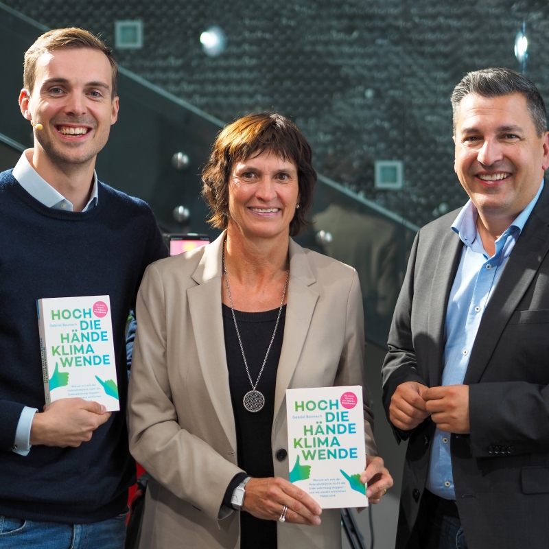 „Hoch die Hände, Klimawende“: So titelt der Buchautor Gabriel Baunach (l.) und begeisterte damit Petra Fraune (GF TVB Tiroler Zugspitz Arena) sowie Marcus Hofer (GF Standortagentur Tirol).