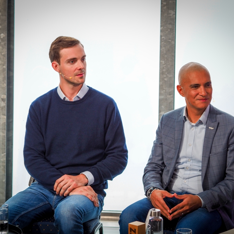 Gabriel Baunach (Buchautor „Hoch die Hände, Klimawende“, l.) sprach über das Konzept des Handabdrucks, Patricio Hetfleisch (Marketingleiter Tirol Werbung) präsentierte das Anreisetool GRETA.