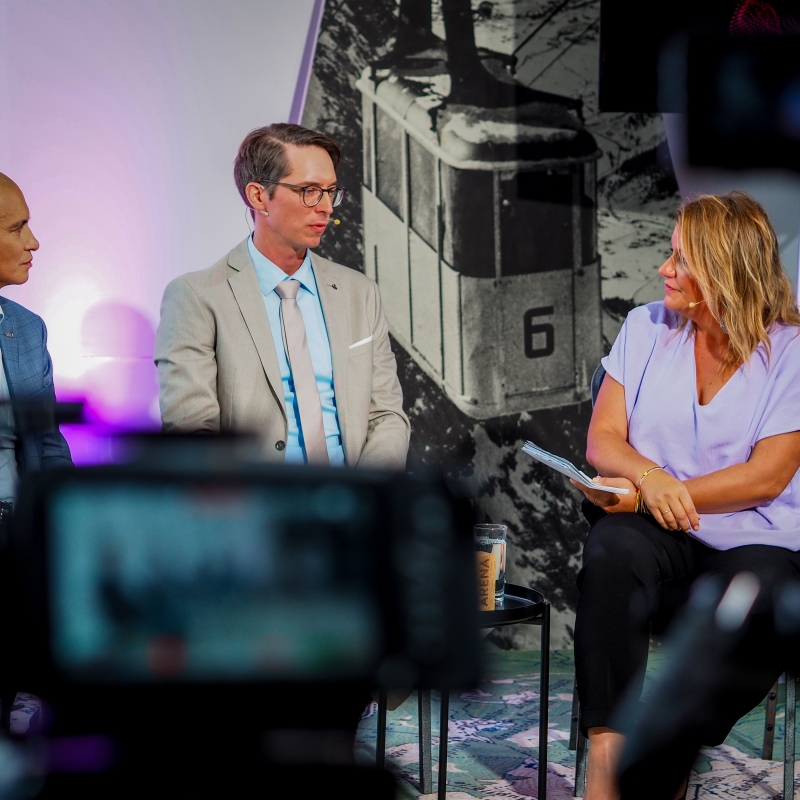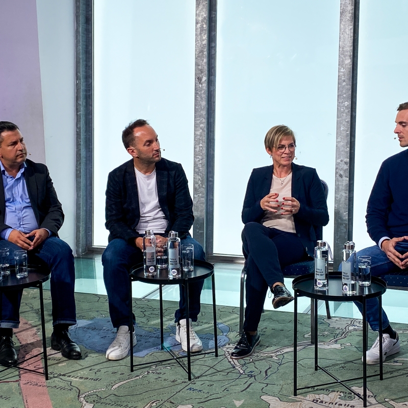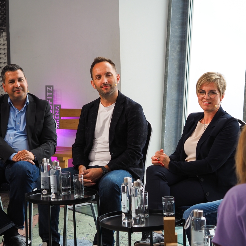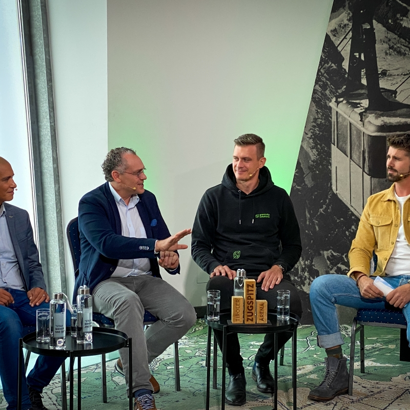 Patricio Hetfleisch (Marketingleiter Tirol Werbung, l.) und Philip Krammer (CEO Terawind) im Öko-Talk mit Moderatorin Verena Schneider.