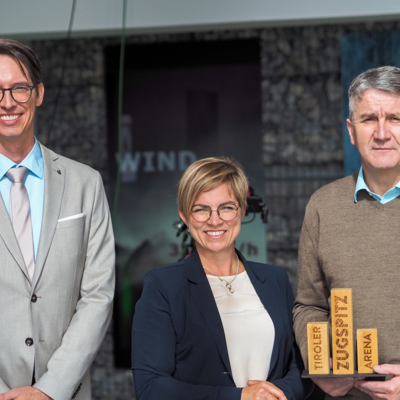 Philip Krammer (CEO Terawind, l.), Michaela Gasser-Mark (Beraterin für Nachhaltigkeit und Klimawandelanpassung) und Theo Zoller (Obmann TVB Tiroler Zugspitz Arena).