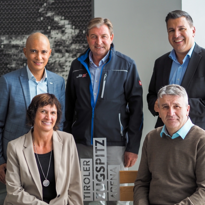 Freuen sich schon auf den im nächsten Jahr stattfindenen AlpenKlimaGipfel: (hinten v.l.) Patricio Hetfleisch (Marketingleiter Tirol Werbung), Franz Dengg (GF Tiroler Zugspitzbahn GmbH) und Marcus Hofer (GF Standortagentur Tirol) sowie (vorne v.l.) Petra Fraune (GF TVB Tiroler Zugspitz Arena) und Theo Zoller (Obmann TVB Tiroler Zugspitz Arena).