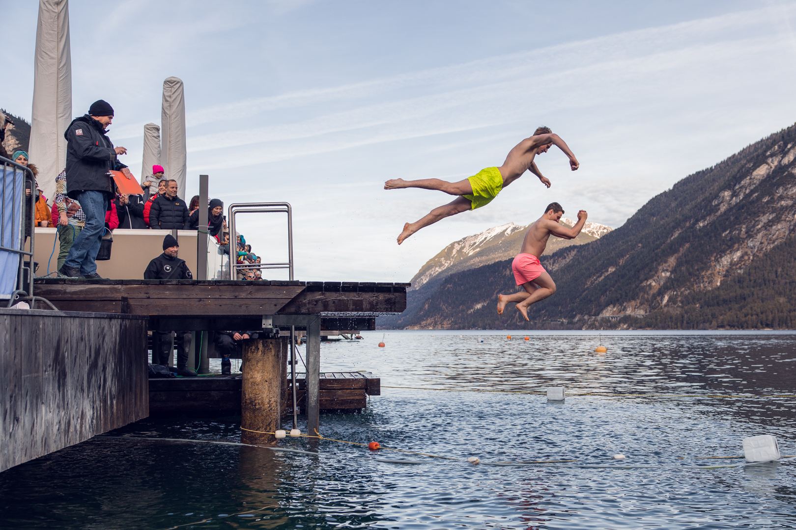 Zum ersten Mal seit zwei Jahren lud der Tauchclub „Black Divers Tirol“ wieder zum Silvesterschwimmen an den Achensee. Der Andrang an der Seepromenade Pertisau war groß: Weit über 100 Teilnehmerinnen und Teilnehmer gingen diesmal an den Start und die wagemutigen Wasserratten hatten einiges an Kälteresistenz unter Beweis zu stellen: Fünf Grad Celsius Wassertemperatur, drei Meter Sprunghöhe und 50 Meter Schwimmdistanz – so die Herausforderungen für die Kategorie „Sport“, in der die Schwimmerinnen und Schwimmer jeweils zu zweit im Kampf gegen den inneren Schweinehund antraten. Erstmals gab es heuer eine getrennte Frauen- und Männerwertung: Schnellste bei den Damen wurde