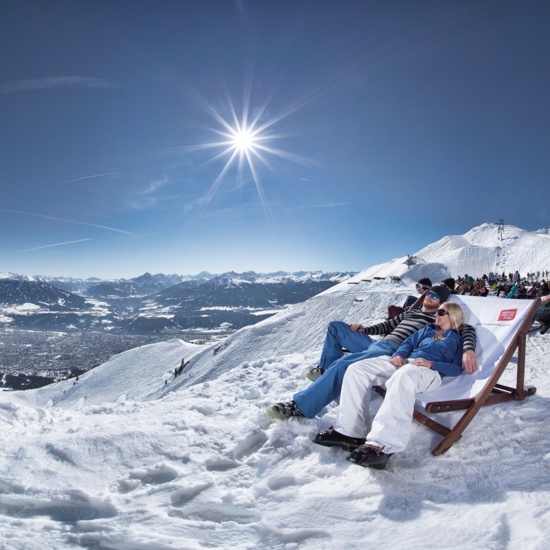 Der einmalige Charakter der Region zeigt sich auf der Seegrube auf eindrucksvolle Weise: In weniger als 30 Minuten gelangt man vom Innsbrucker Stadtzentrum auf 1.905 Meter Höhe, wo sich ein atemberaubender Blick auf die alpin-urbane Kulisse eröffnet. Hier schwebt man wahrlich auf Wolke neun – genauer gesagt auf der Cloud 9, die Bar mit einmaliger Sonnenterrasse, wo man coole Drinks in einer der Liegen genießt. Und wer möchte, nimmt die Bergbahn aufs Hafelekar, um am höchsten Aussichtspunkt, dem „Top of Innsbruck“ auf 2.334 Metern, der Wintersonne dabei zuzusehen, wie sie die glitzernden Gipfel in ihr warmes Licht taucht.