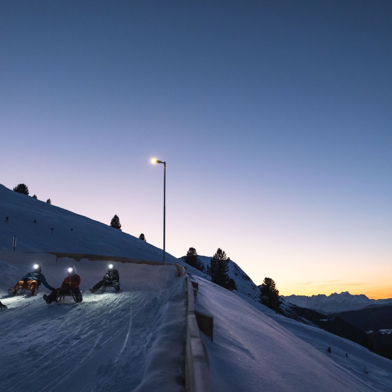 Als eine der längsten und abwechslungsreichsten der Region schlängelt sich die Rodelbahn am Rangger Köpfl über acht Kilometer und drei Teilstrecken ins Tal. Sie ist bequem per Bergbahn erreichbar, was für jede:n – egal ob jung oder alt, sportlich oder gemütlich – eine vergnügliche Rodelpartie garantiert. Hoch hinaus geht es ebenso in Kühtai: Tirols höchstgelegene Rodelbahn führt hinauf auf 2.020 Meter zum Graf-Ferdinand-Haus, wo man sich in gemütlicher Atmosphäre stärken kann. Beide Bahnen sind übrigens auch beleuchtet: Am Rangger Köpfl sorgt das Nachtrodeln je nach Schneelage zweimal wöchentlich für Momente, an die man sich gerne erinnert, in Kühtai sogar täglich.