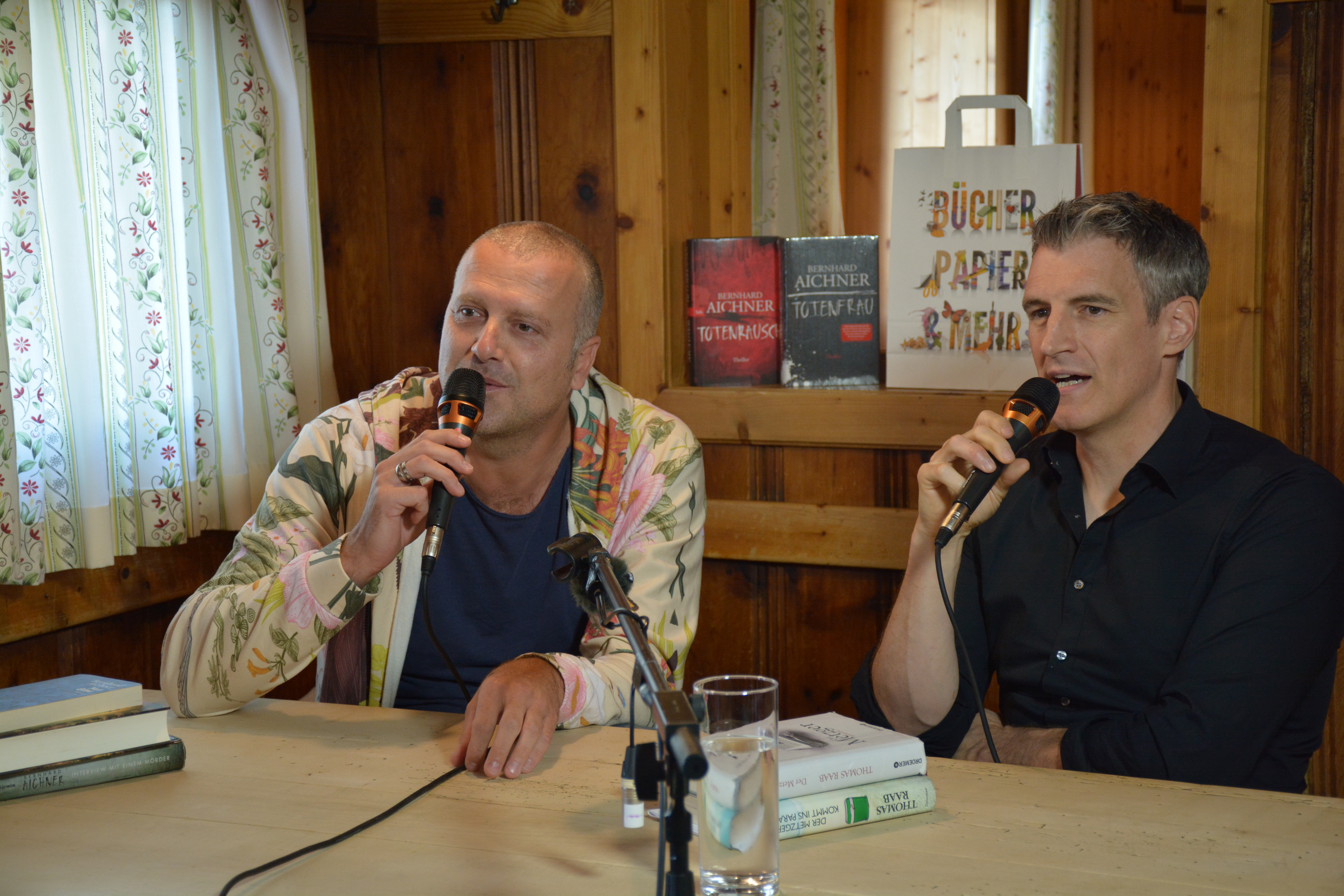 Thomas Raab baten zu weit mehr als einer Lesung: die beiden erzählten interessante und großteils sehr launige Geschichten aus ihren Leben als Schriftsteller und lasen dann quasi „nebenbei“ Passagen aus ihren Erfolgsbüchern. Zusätzlich überraschten sie das Publikum mit zwei Premieren: Bernhard Aichner las erstmals aus seinem am 1. Oktober erscheinenden Krimi „Bösland“ (btb Verlang) , Thomas Raab stellte „Walter muss weg“ (KiWi Verlag) vor: Hier macht sich ab dem 7. September Hannelore Huber auf die Suche nach einer verschwundenen Leiche, die zufällig auch ihr Ehemann war.