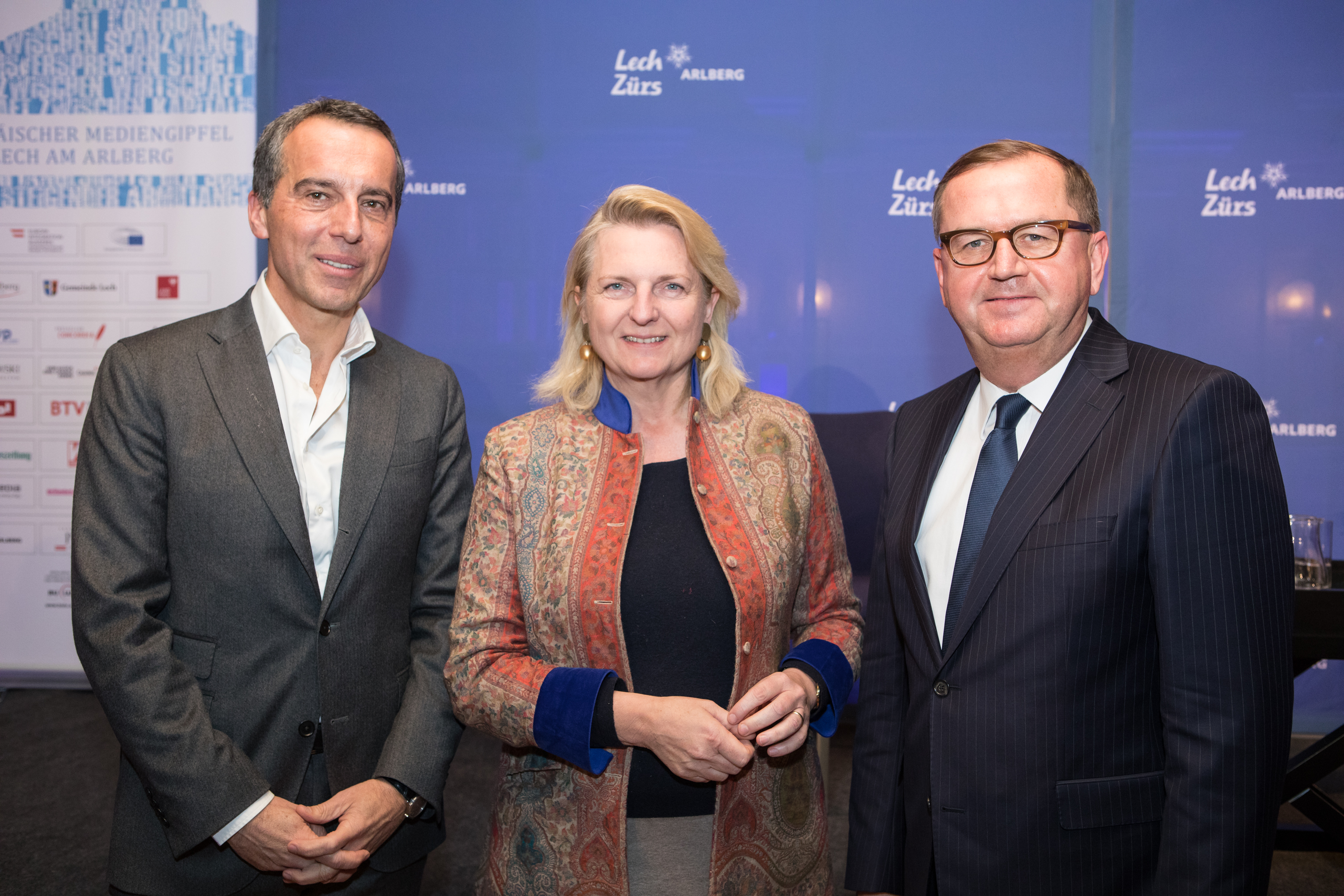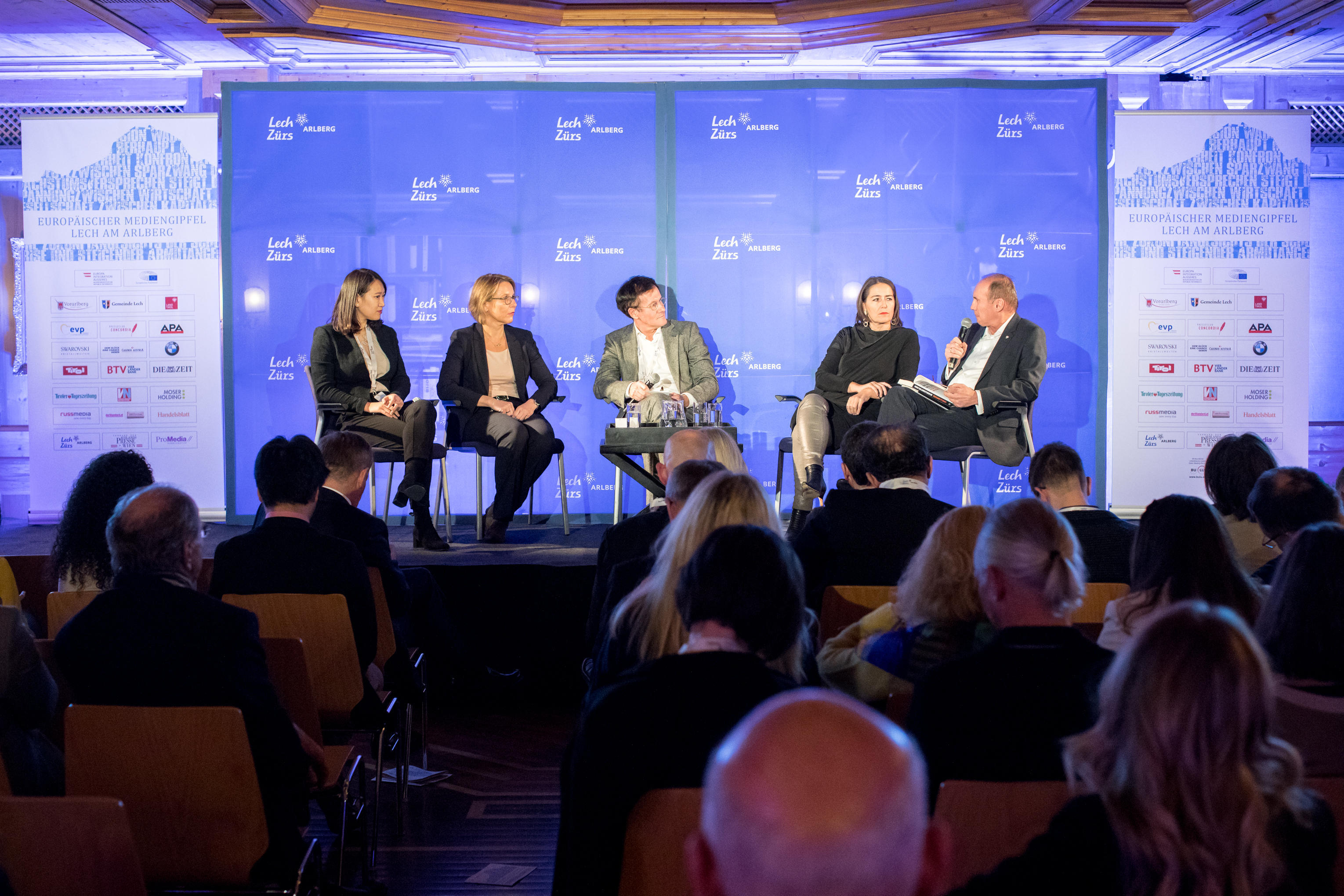 Im Rahmen des Mediengipfels fand in Lech auch die Liveübertragung der „Runde der ChefredakteurInnen“ auf ORF III statt. Ingrid Thurnher leitete die Diskussion mit Rainer Nowak (Die Presse), Gerold Riedmann (Vorarlberger Nachrichten), Paul Ronzheimer (BILD), Eva Linsinger (Profil) und Petra Stuiber (Der Standard).
