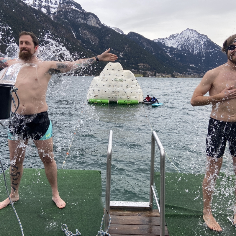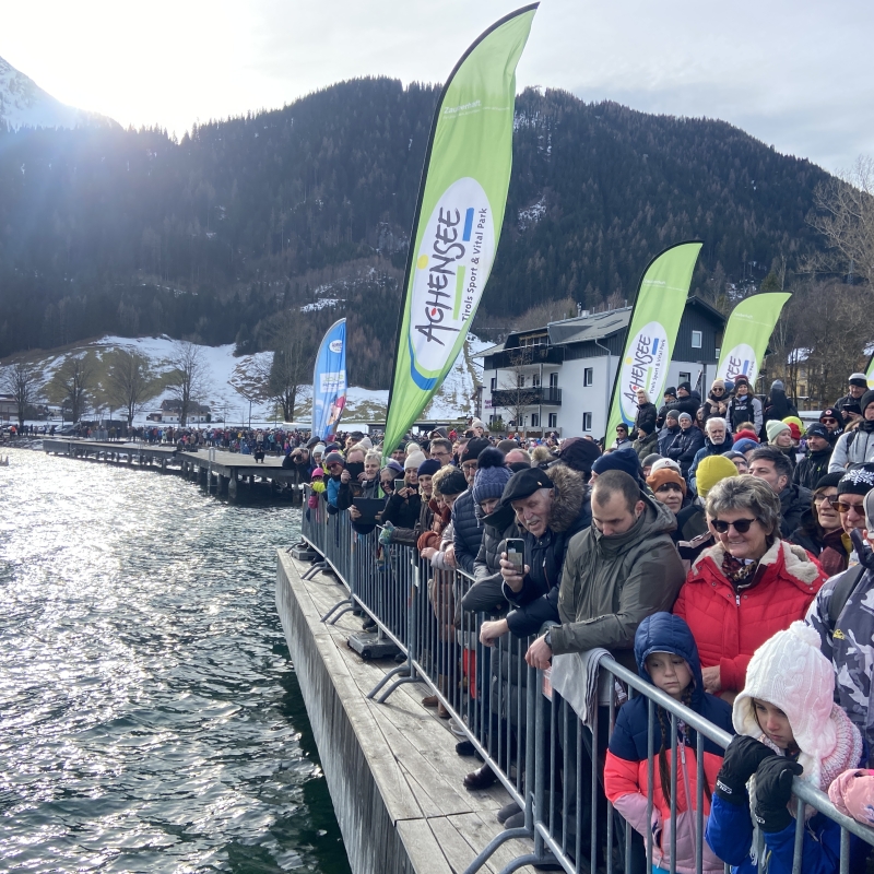 Bei angenehmem Winterwetter war eine Hundertschaft an Zuseherinnen und Zusehern nach Pertisau gekommen, um beim 21. Silvesterschwimmen am Achensee live dabei zu sein.