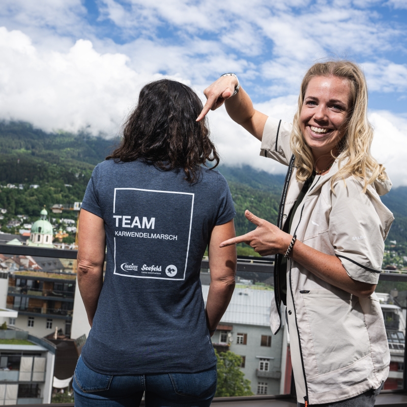 Frauenpower beim Karwendelmarsch-Team: Maria Wirtenberger (Stv. Geschäftsführerin Achensee Tourismus) zeigt Flagge für das „Volksfest für Wander- und Berglaufbegeisterte". Natalie Koller freut sich gemeinsam mit ihr auf den 15. Karwendelmarsch am 31. August 2024.