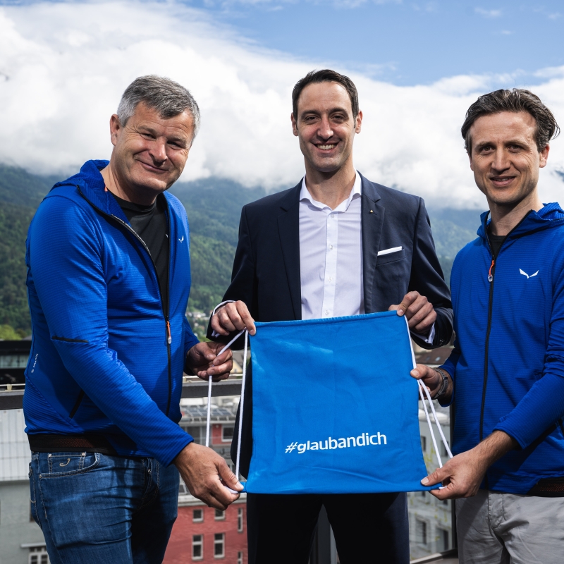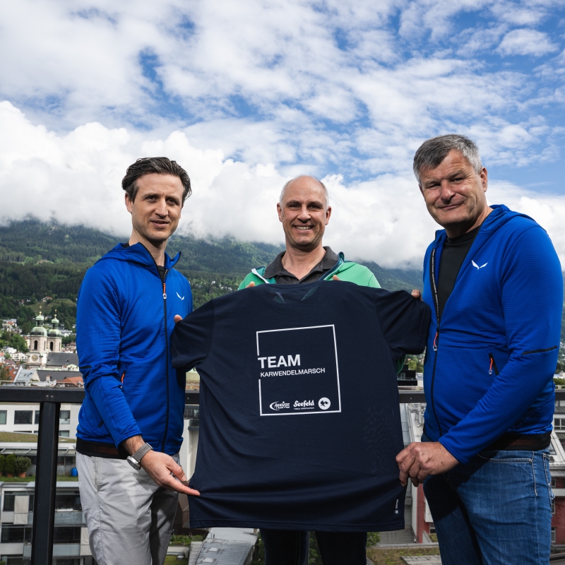 #glaubandich. Die Tiroler Sparkasse ist mit einem eigenen Team beim Karwendelmarsch dabei. Walter Lackner (Tiroler Sparkasse, Mi.) gratuliert Martin Tschoner (li.) und Elias Walser zum 15. Jubiläum des Events.