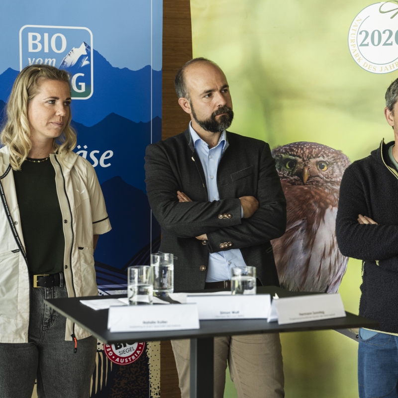 Wichtige Partner für den Karwendelmarsch sind Salewa und BIO vom BERG. Im Projekt „Spuren der Artenvielfalt“ wiederum werden Erlöse aus dem Ticketverkauf nachhaltig zum Einsatz gebracht (v.l.): Natalie Koller (Salewa), Simon Wolf (BIO vom BERG) und Hermann Sonntag (Projektverantwortlicher „Spuren der Artenvielfalt“).