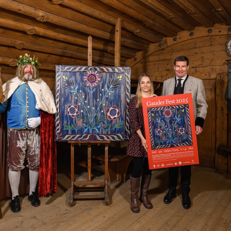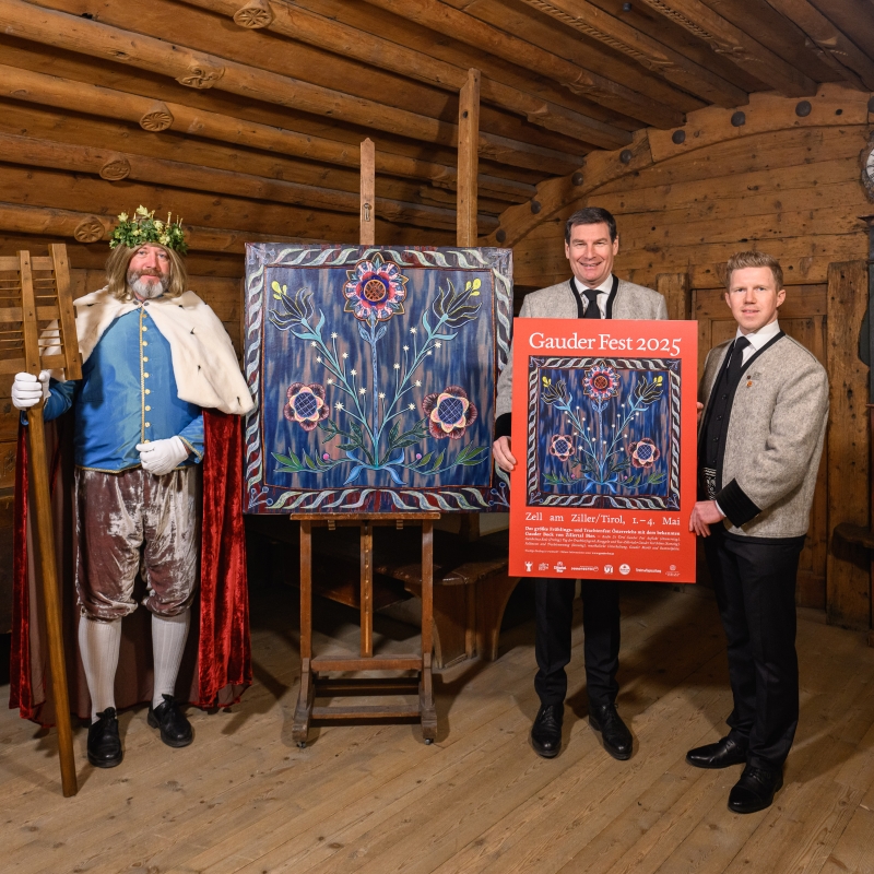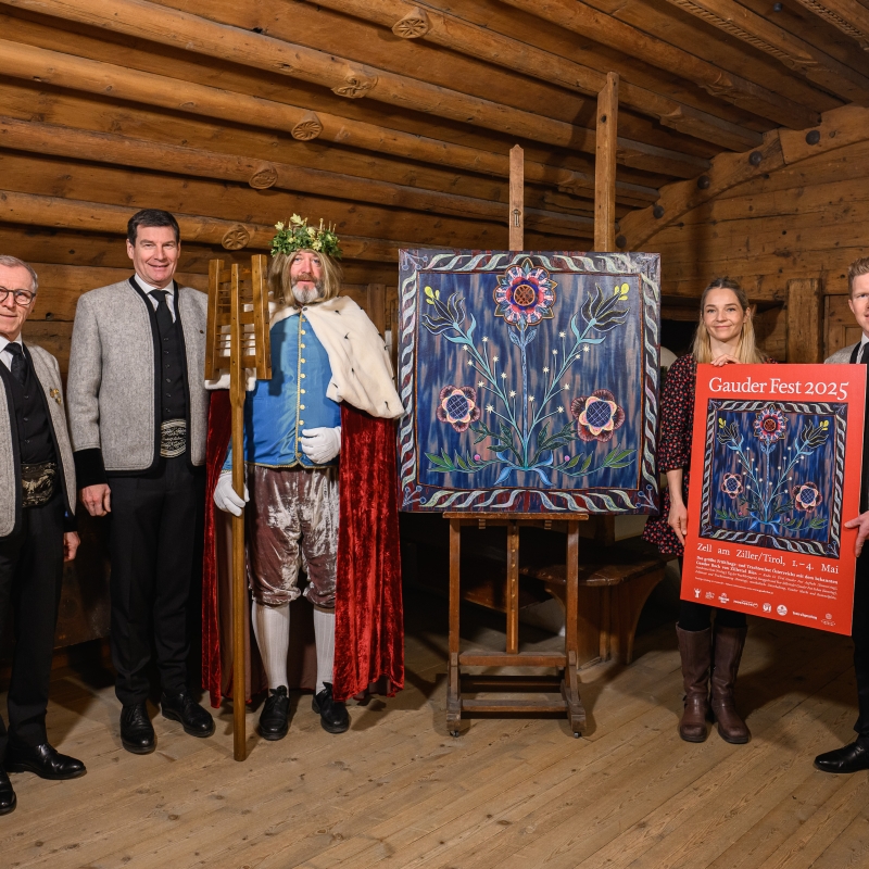 Das diesjährige Gauder Fest-Sujet stammt von der Tuxer Künstlerin Vanja Krajnc und thematisiert die Zillertaler Tracht (v.l. Ehrenobmann des Tiroler Trachtenverbandes Oswald Gredler, Geschäftsführer Zillertal Bier Martin Lechner, Bierkönig Gambrinus, Künstlerin Vanja Krajnc und Christian Daum, Geschäftsführer TVB Zell-Gerlos, Zillertal Arena.