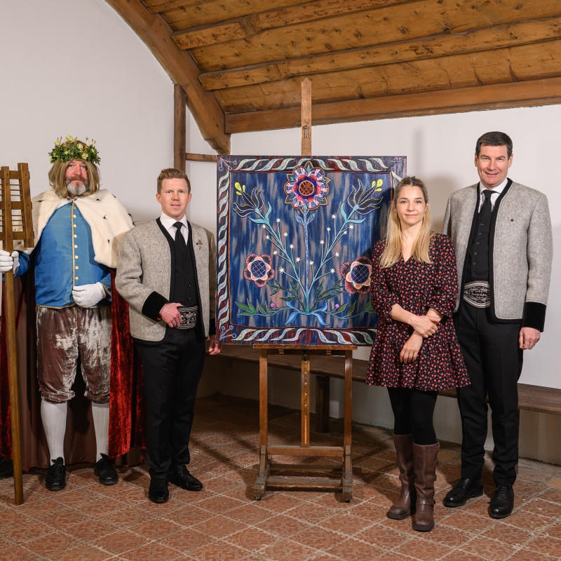 v.l.: Leiter des Tiroler Volkskunstmuseums Dr. Karl C. Berger, Bierkönig Gambrinus, Geschäftsführer des Tourismusverbandes Zell-Gerlos, Zillertal Arena, Künstlerin Vanja Krajnc, Geschäftsführer von Zillertal Bier Martin Lechner und Ehrenobmann des Tiroler Trachtenverbandes Oswald Gredler.