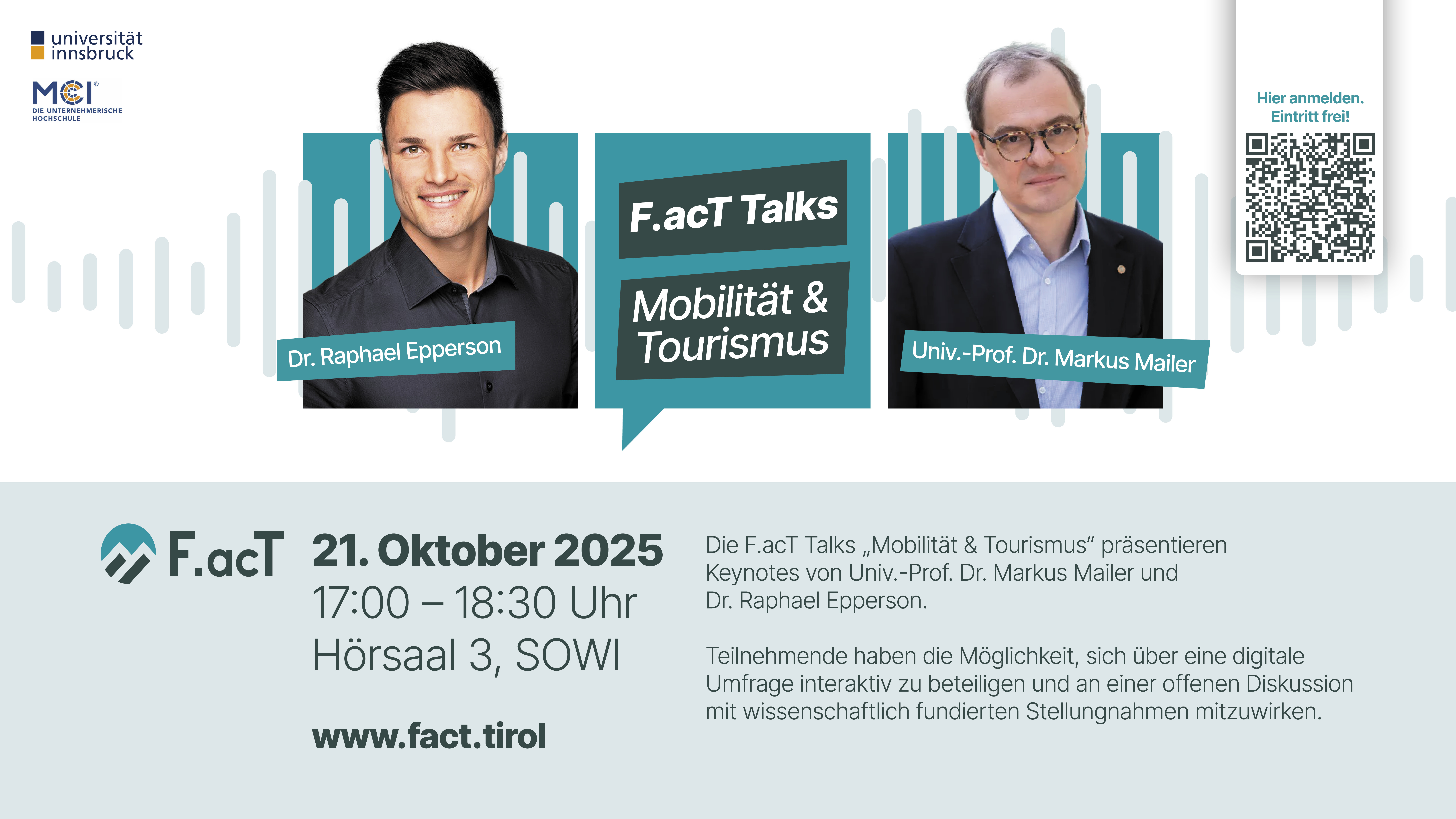 In Kooperation mit dem Land Tirol, der Universität Innsbruck und dem MCI | Die Unternehmerische Hochschule lädt F.acT am 21. Oktober von 17:00 bis 18:30 Uhr in den Hörsaal 3 der SOWI-Fakultät in Innsbruck ein. Im Fokus der ersten F.acT-Talks steht das Thema „Mobilität im Tourismus“. Während Univ.-Prof. Dr. Markus Mailer, Mobilitätsexperte der Universität Innsbruck, Einblicke in aktuelle Herausforderungen und Chancen der touristischen Mobilität gibt, beleuchtet Dr. Raphael Epperson Entscheidungsprozesse und Verhaltensmuster rund um das Reisen.