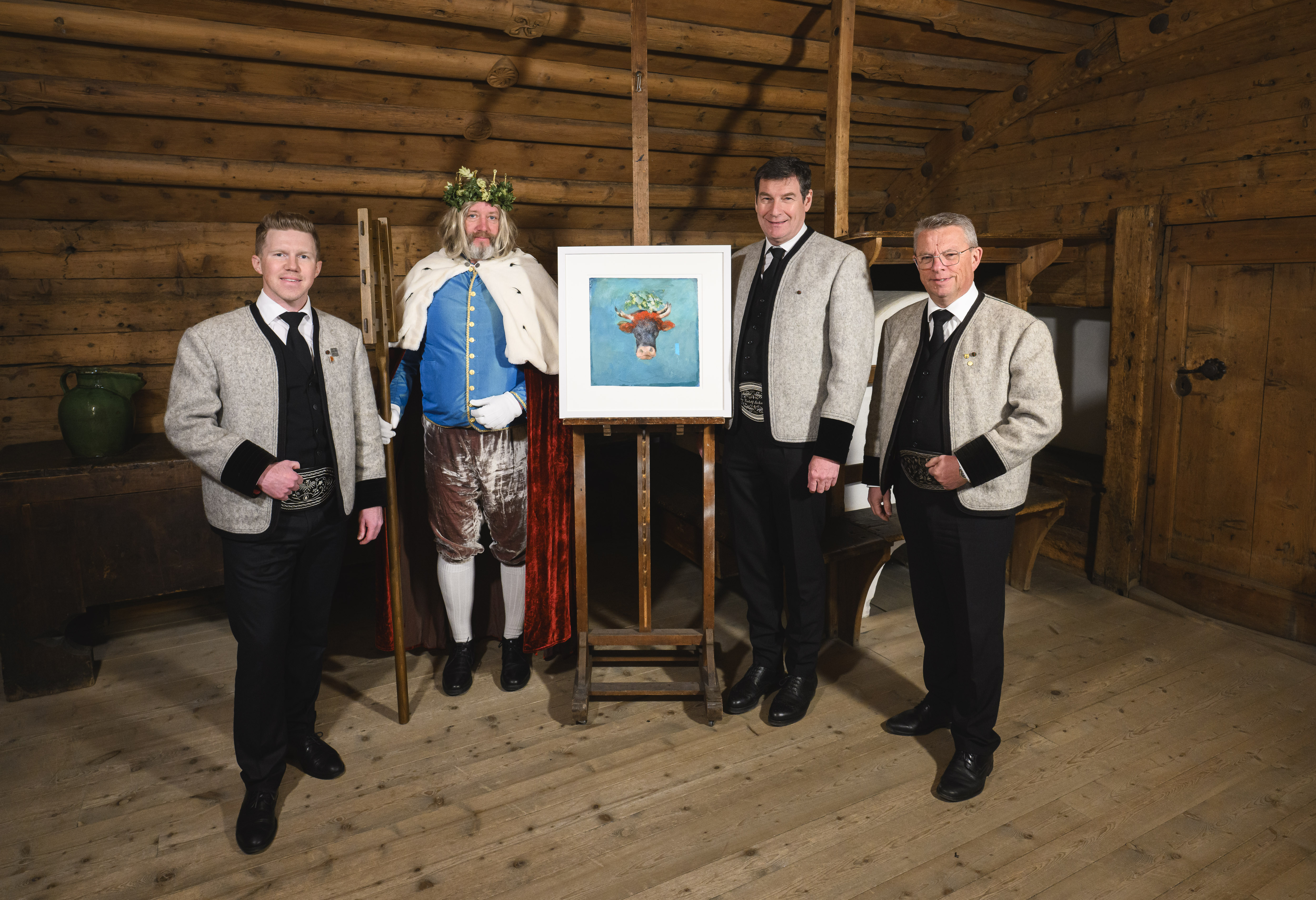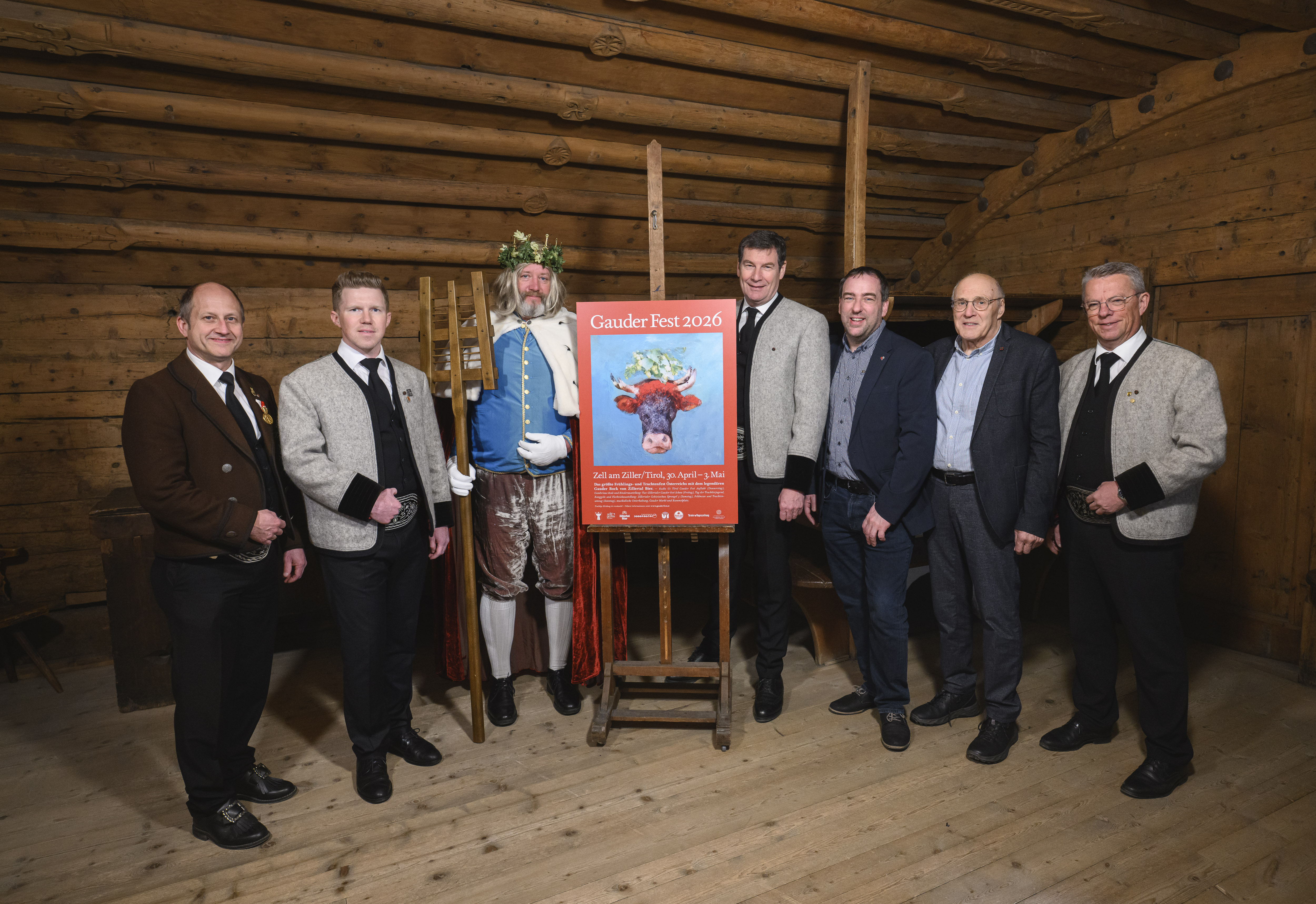 Präsentierten kürzlich das neue Sujet für das Gauder Fest 2026: v.l. Christian Daum (Geschäftsführer TVB Zell-Gerlos, Zillertal Arena), Bierkönig Gambrinus, Martin Lechner (Geschäftsführer Zillertal Bier), Günther Dankl (Kurator und langjähriger Kustos der Graphischen Sammlungen am Tiroler Landesmuseum Ferdinandeum) und Robert Pramstrahler (Bürgermeister Gemeinde Zell am Ziller).