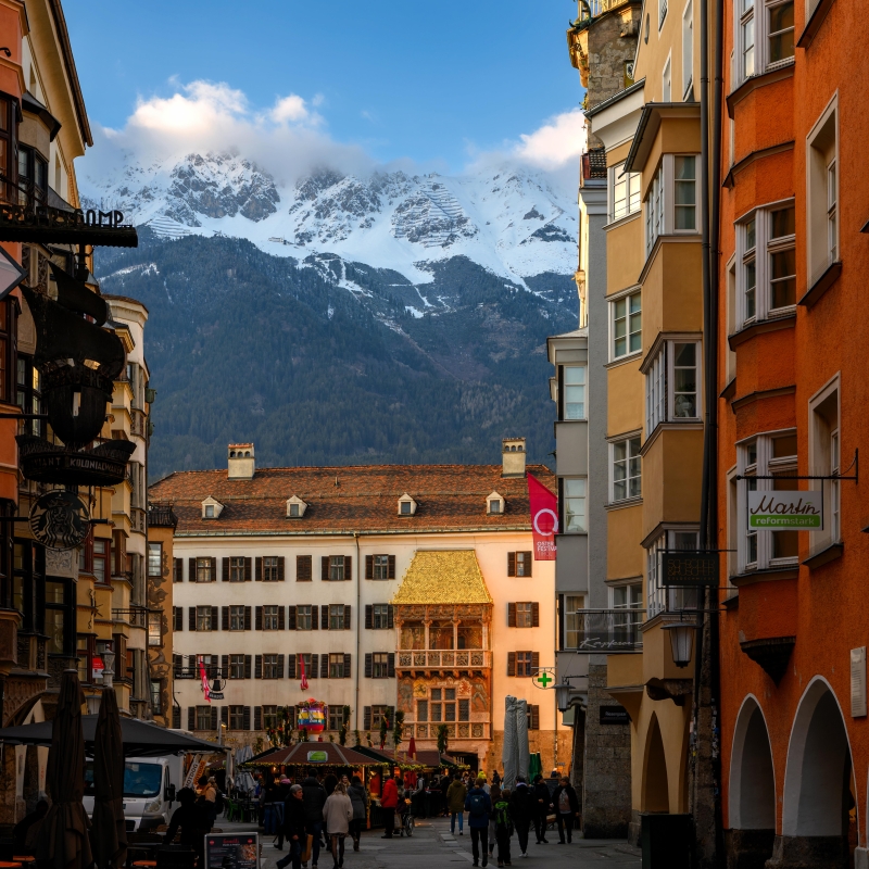 Zwei Welten an einem Tag – in der Region Innsbruck ist das nicht nur möglich, sondern selbstverständlich. So überwinden die Nordkettenbahnen, deren Talstation nur wenige Gehminuten vom Stadtzentrum entfernt liegt, in rund 30 Minuten den Höhenunterschied zwischen der Altstadt und der Bergstation Hafelekar auf 2.256 Metern. Dort offenbart sich ein spektakulärer Blick über das Karwendel, auch nehmen hier der Geotrail sowie der Goetheweg ihren Anfang. Dank kurzer Distanzen bleibt nach der alpinen Entdeckungsreise noch genügend Zeit für einen Trip in städtische Gefilde: Die Walks to Explore führen auf Themenwegen durch die Tiroler Landeshauptstadt – vorbei an bekannten Highlights wie dem funkelnden Goldenen Dachl und den Habsburger Residenzen, aber auch zu versteckten Schätzen abseits vielbegangener Pfade. Zwischen mittelalterlichen Gassen und lebendigen Vierteln erzählt jede Route dabei ihre eigene Geschichte.