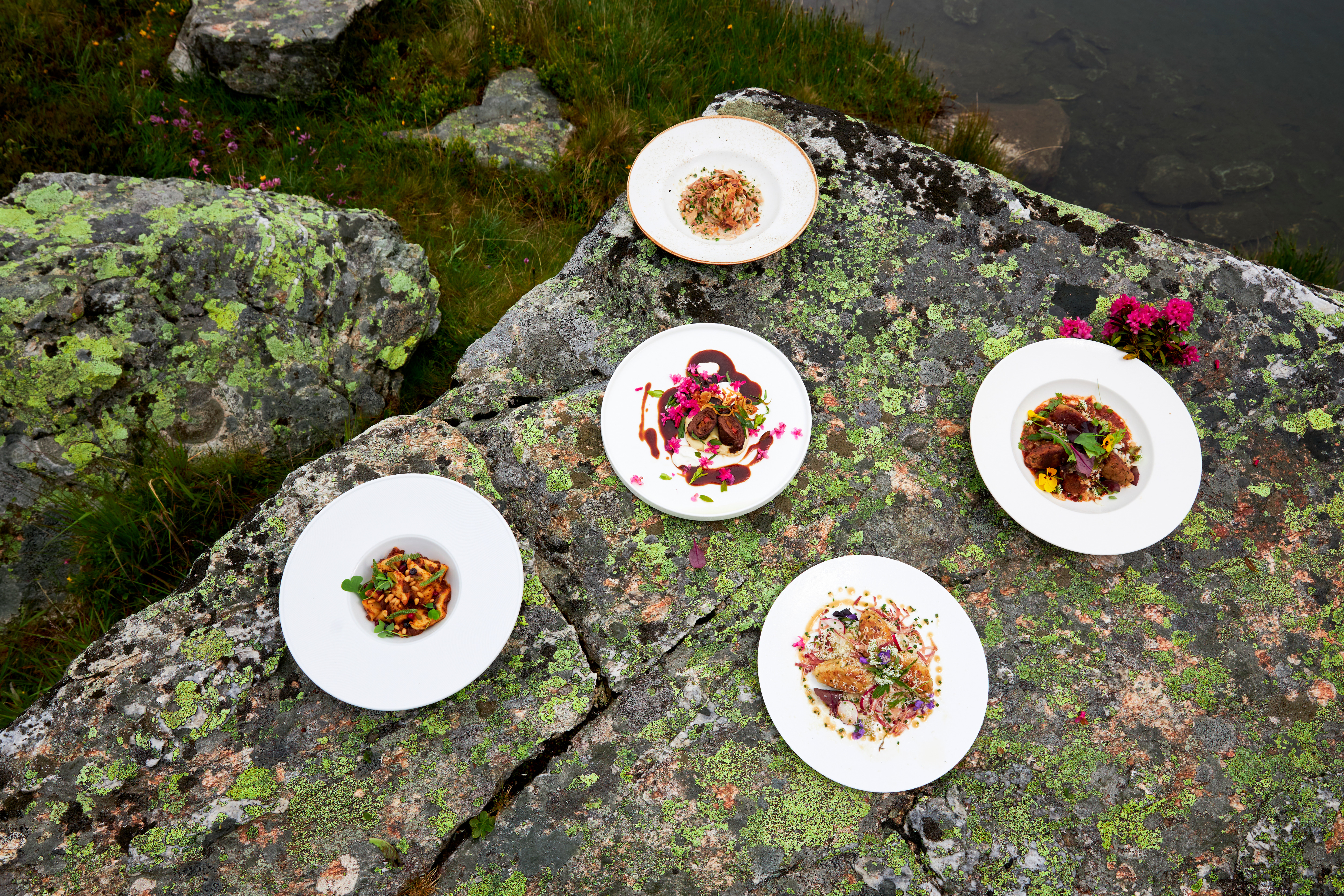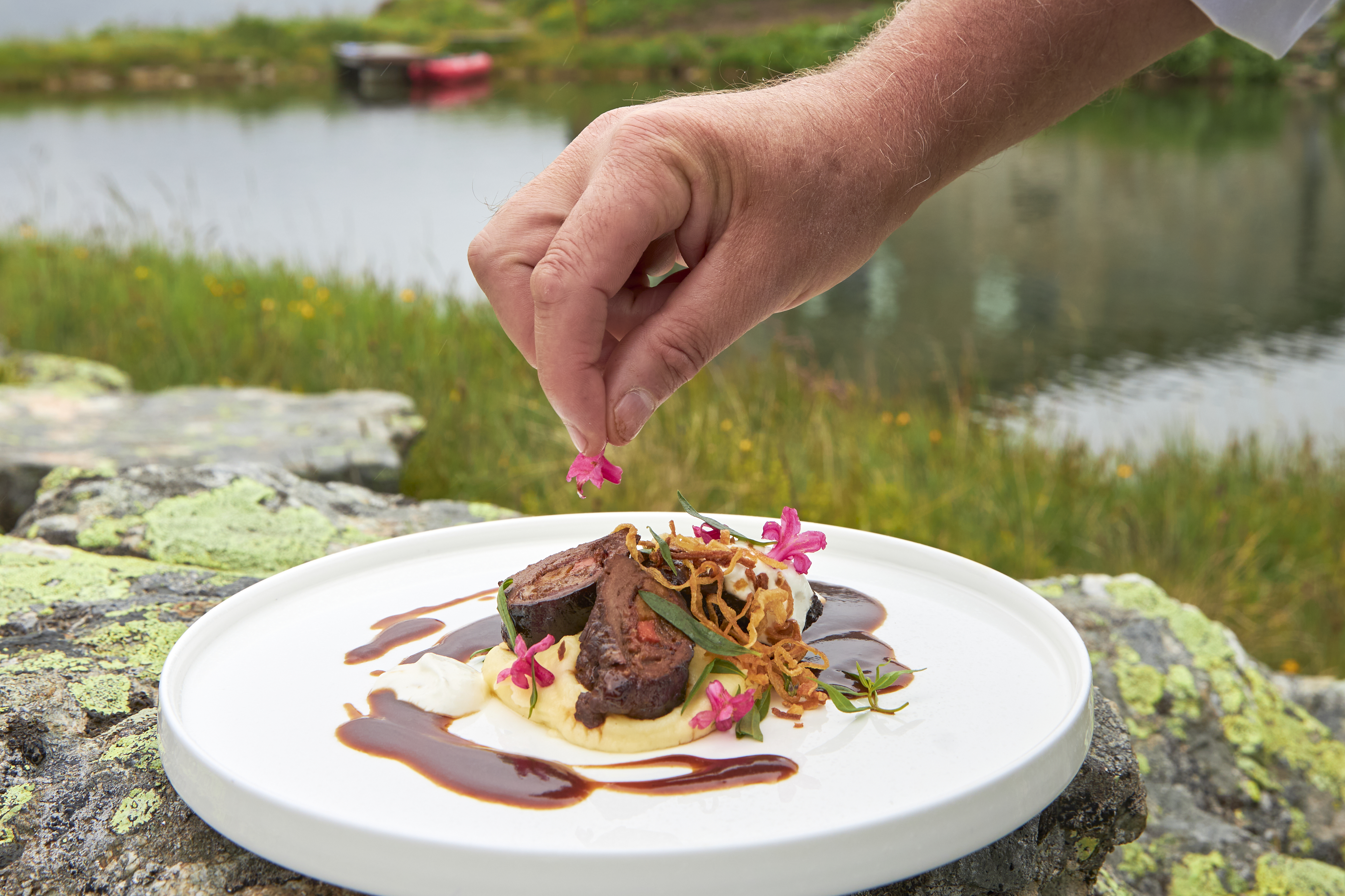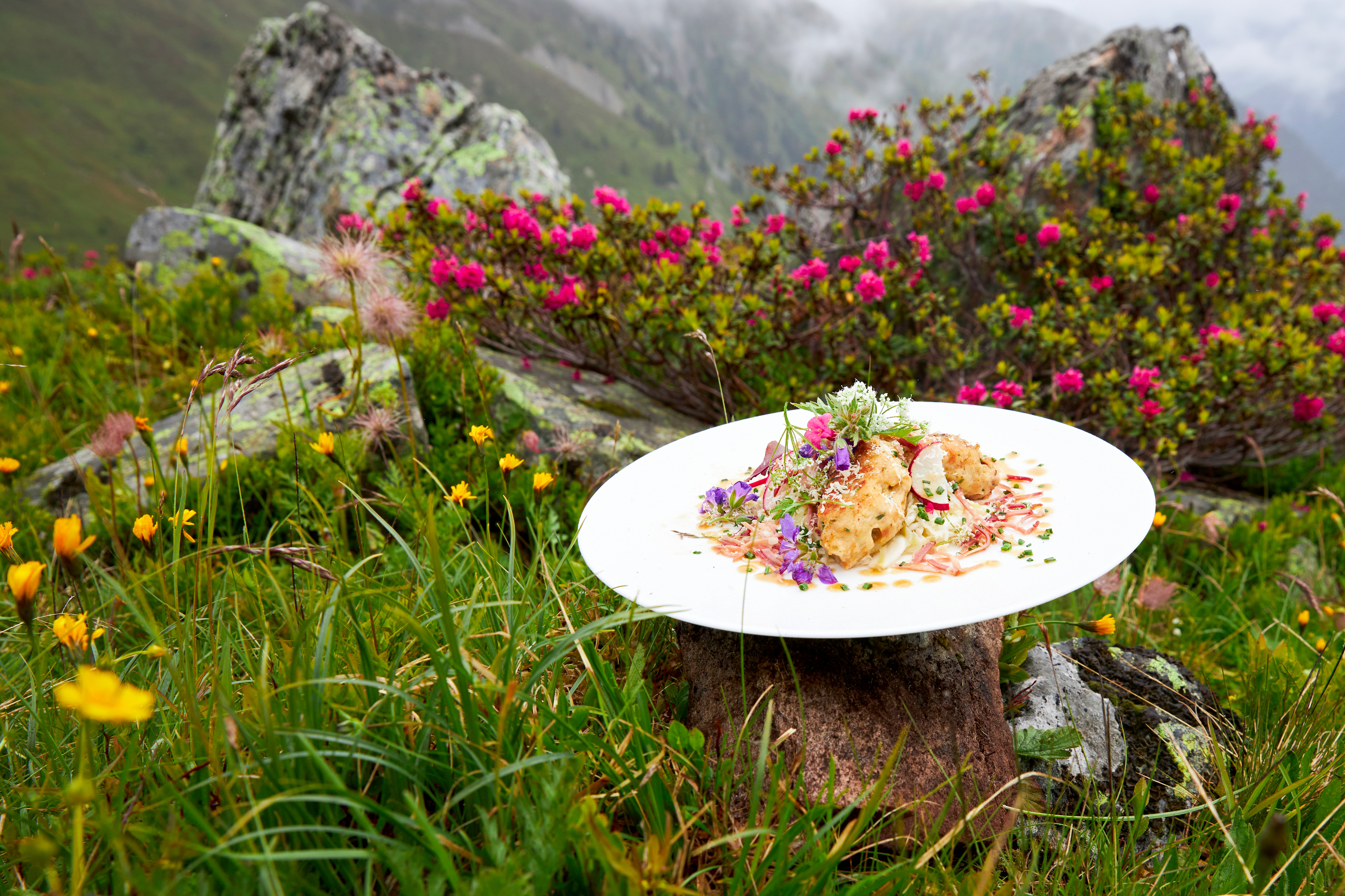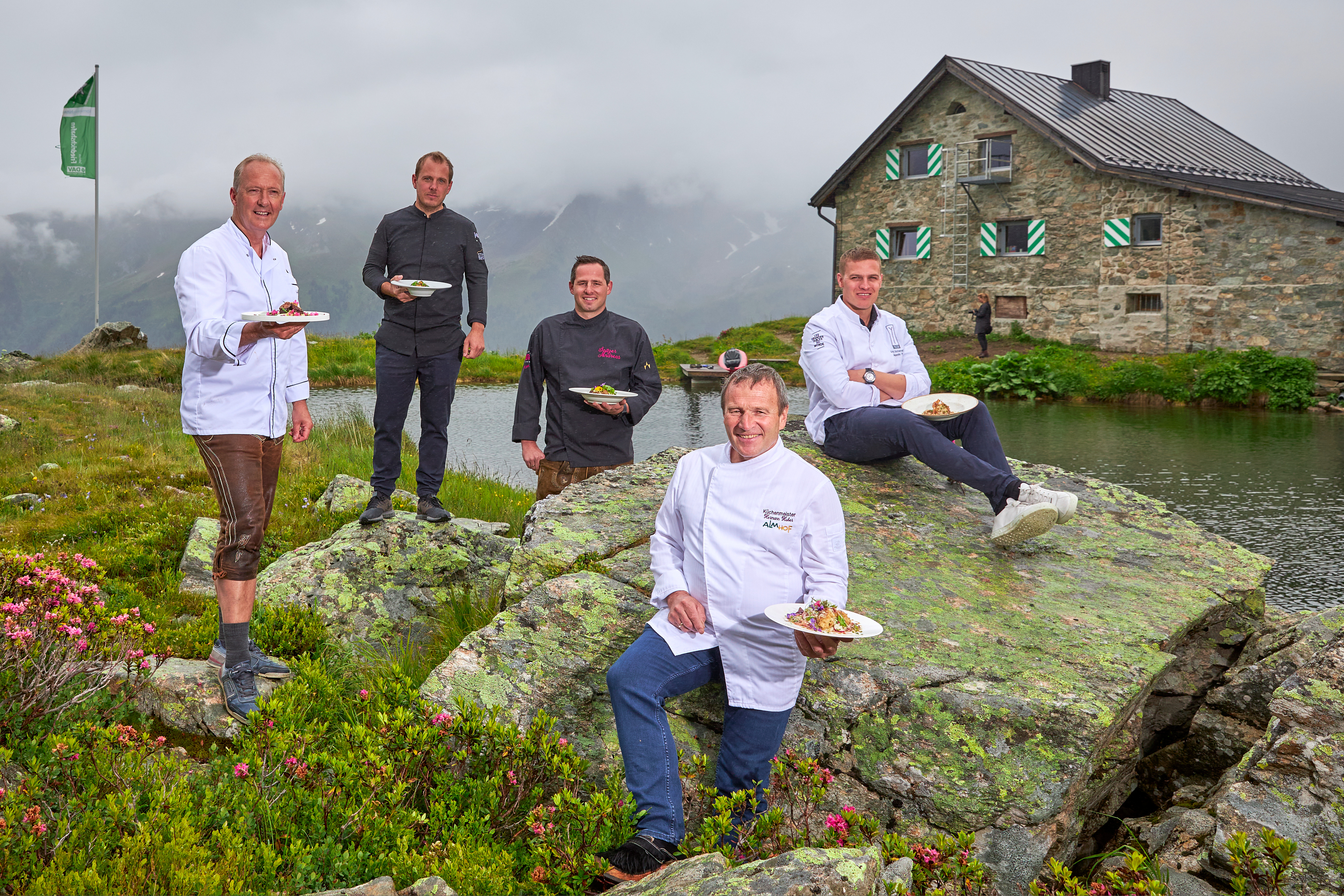 Paznauner Spitzenköche Gunther Döberl, Hermann Huber, Benjamin Parth, Martin Sieberer und Andreas Spitzer einen Sommer lang die Patenschaft für je eine Berghütte und kreieren ein raffiniertes, bodenständiges Gericht aus regionalen Zutaten. Dieses Gericht finden Wanderer dann den ganzen Sommer über auf der jeweiligen Hüttenspeisekarte. Zu verkosten gibt es Paznauner Bergkäsenocken mit warmem Spitzkohlsalat, Speck-Pfifferlingsknödel, Alpen-Bolognese vom Wild mit Erdäpfelgnocchi, Roulade vom Paznauner Hochlandrind mit Erdäpfeln, Rauch und Zwiebel sowie Rindsgulasch mit Steinpilz-Bergkäse-Nockerl, Wildkräuter-Salat und Zwiebelknusper.