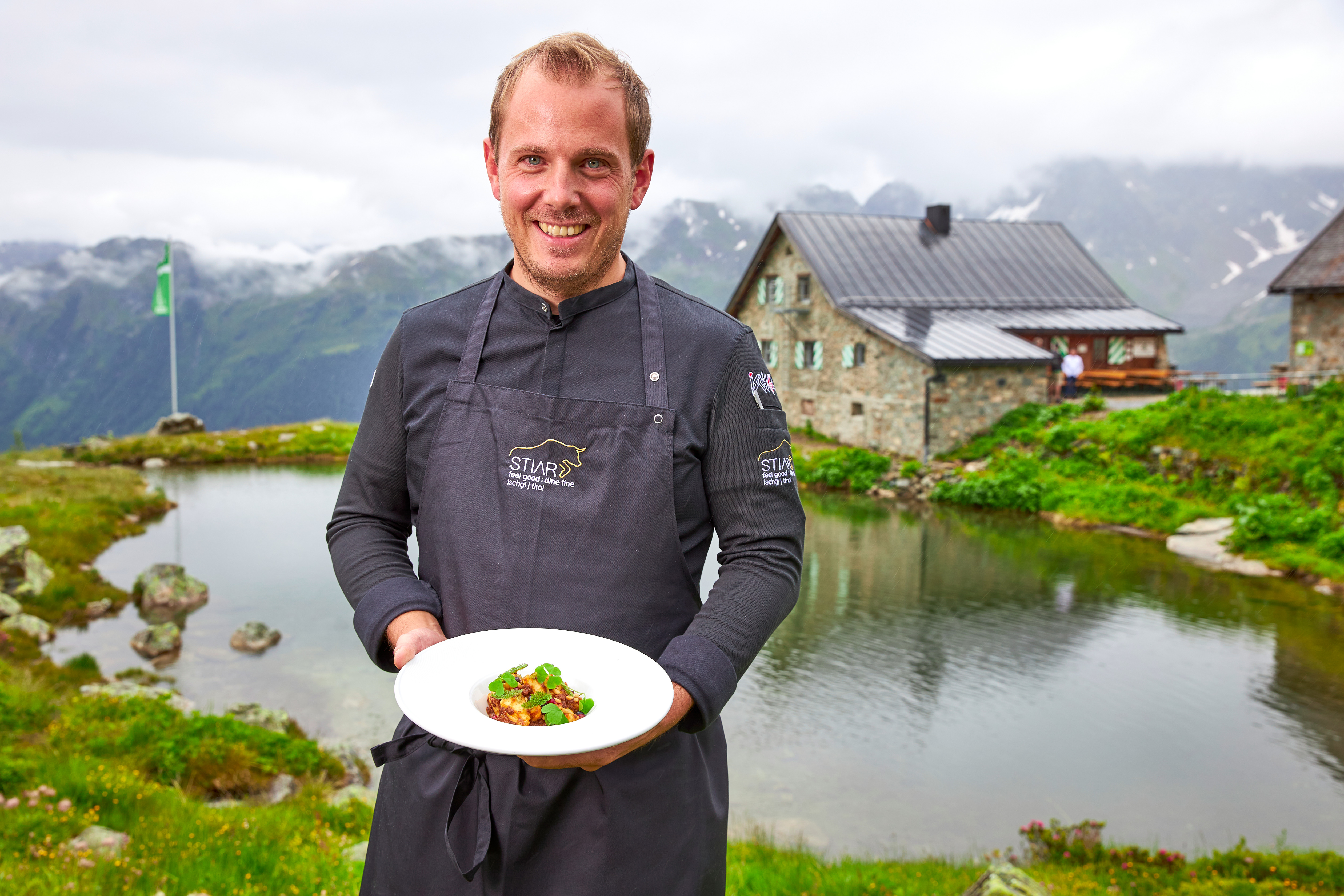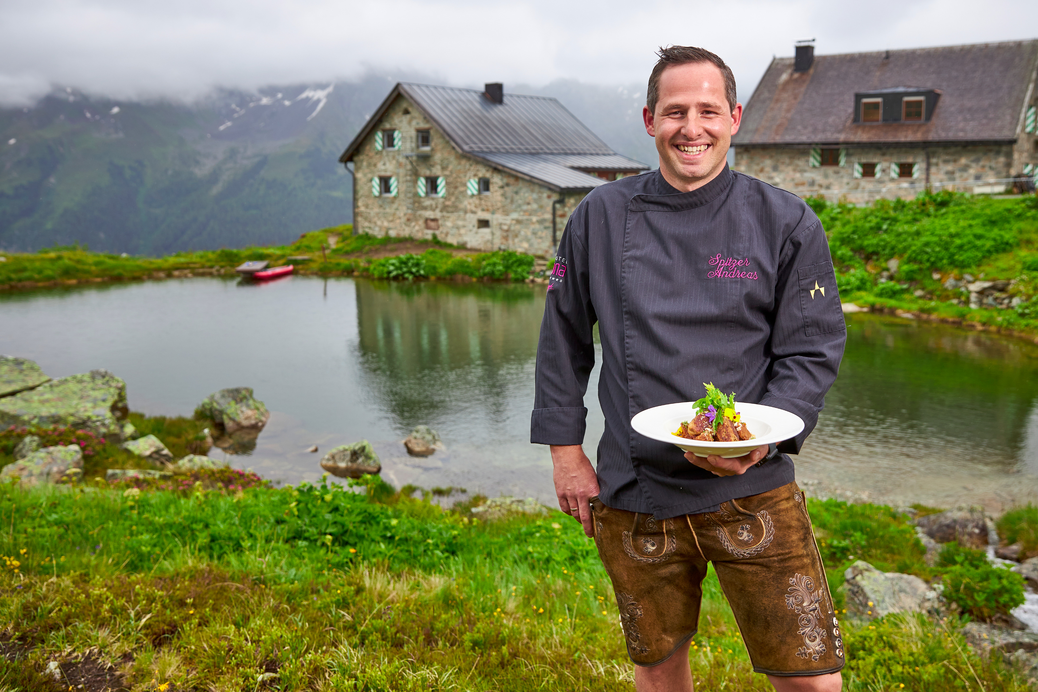 Ascherhütte: Andreas Spitzer (Fliana Gourmet, Hotel Fliana) Internationale Küche mit Bodenhaftung. Nach der Kochlehre in Maria Alm und lehrreichen Stationen in Ischgl ergriff Andreas Spitzer mit 24 Jahren die Chance als Küchenchef im ****S-Hotel Fliana durchzustarten. Heute holt er sich die besten Lebensmittel aus der ganzen Welt und versucht sie mit den heimischen Produkten und Kostbarkeiten aus dem Paznaun zu verbinden. Dabei tüftelt er an Texturen, Farbkombinationen und Geschmäckern. Spitzers Küche ist weltoffen und gleichzeitig verwurzelt und verbunden mit der Paznauner Landwirtschaft. Die Leidenschaft, die der Haubenkoch auf die Teller bringt, wurde mit drei Hauben von Gault&Millau bedacht. Inspiration für seine kulinarischen Kreationen findet Spitzer in den Paznauner Bergen. Sein Gericht für die Ascherhütte: Rindsgulasch mit Steinpilz-Bergkäse-Nockerl, Wildkräuter-Salat und Zwiebelknusper