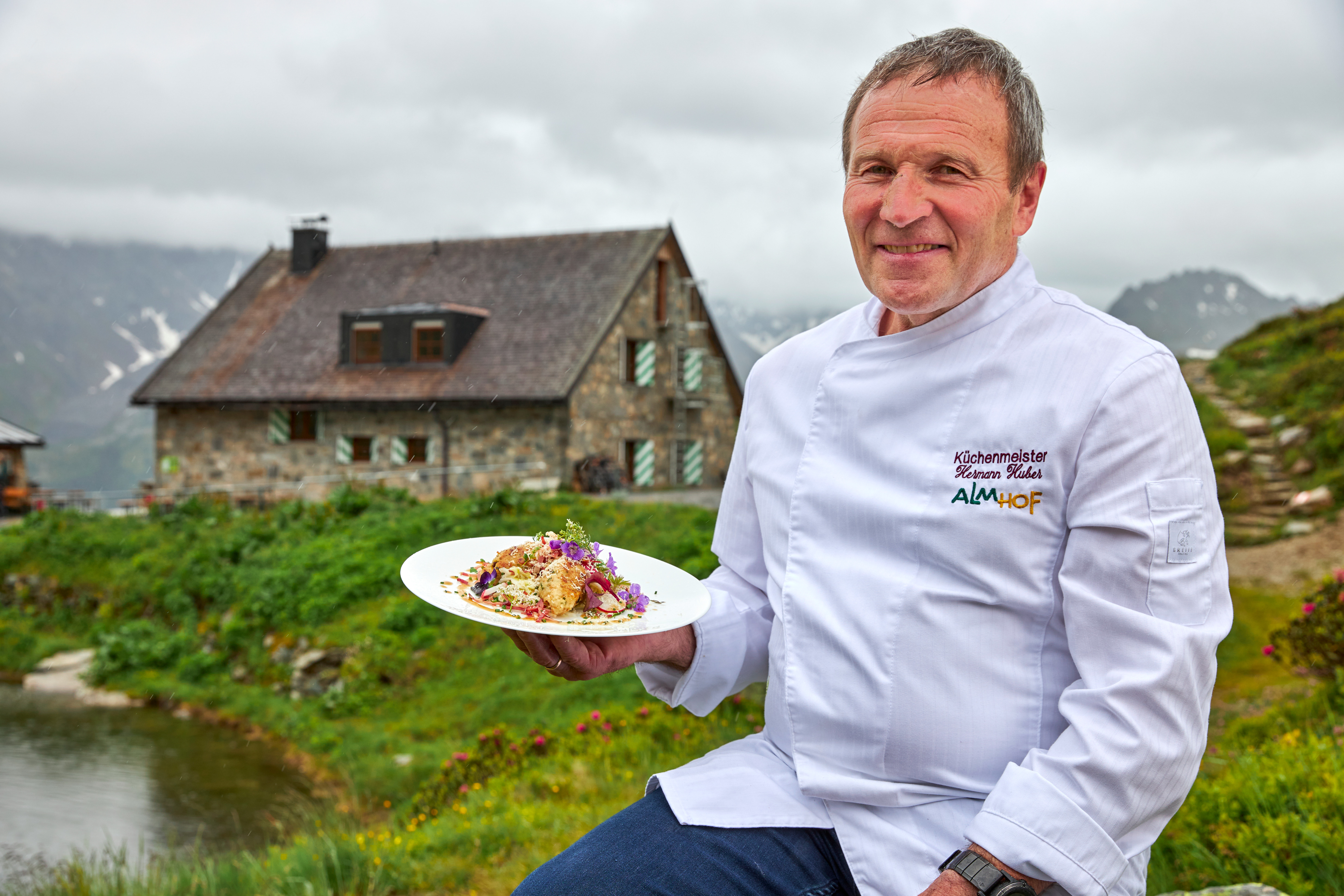 Jamtalhütte: Hermann Huber (Hotel Almhof Galtür) Hermann Huber – seit nahezu 40 Jahren Küchenchef im Huber-Hotel Almhof**** in Galtür – hat viel erreicht. Mit seinem mehrmals ausgezeichneten Käse konnte er sich bereits auf nationaler wie auch internationaler Ebene einen Namen machen. Ausruhen möchte sich der Hotelier, Küchenmeister und leidenschaftliche Senner auf seinen Lorbeeren nicht. Auch heute noch lässt er sich sowohl von internationalen als auch nationalen, aber natürlich allen voran regionalen Produkten und Gerichten inspirieren. Ob Sennerei oder Küche, er ist immer auf der Suche nach Neuem, um sich von der Masse abzuheben. Sein Gericht für die Jamtalhütte: