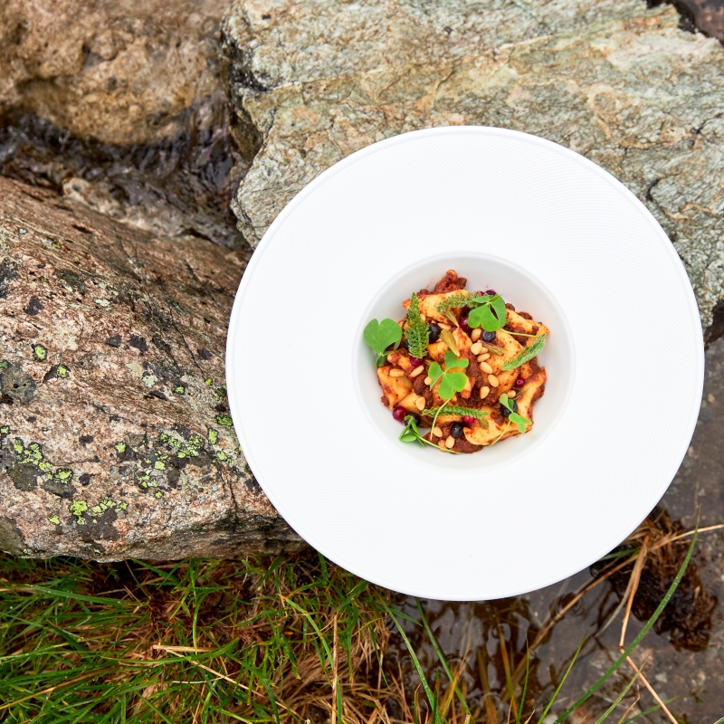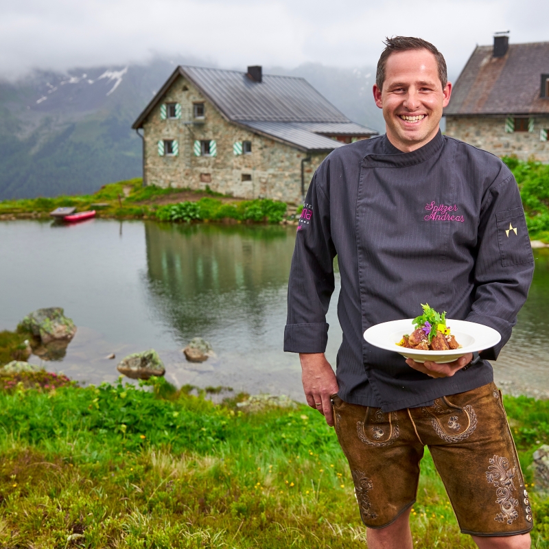 Internationale Küche mit Bodenhaftung. Nach der Kochlehre in Maria Alm und lehrreichen Stationen in Ischgl ergriff Andreas Spitzer mit 24 Jahren die Chance als Küchenchef im ****S-Hotel Fliana durchzustarten. Heute holt er sich die besten Lebensmittel aus der ganzen Welt und versucht sie mit den heimischen Produkten und Kostbarkeiten aus dem Paznaun zu verbinden. Dabei tüftelt er an Texturen, Farbkombinationen und Geschmäckern. Spitzers Küche ist weltoffen und gleichzeitig verwurzelt und verbunden mit der Paznauner Landwirtschaft. Die Leidenschaft, die der Haubenkoch auf die Teller bringt, wurde mit drei Hauben von Gault&Millau bedacht. Inspiration für seine kulinarischen Kreationen findet Spitzer in den Paznauner Bergen. Sein Gericht für die Ascherhütte: Rindsgulasch mit Steinpilz-Bergkäse-Nockerl, Wildkräuter-Salat und Zwiebelknusper
