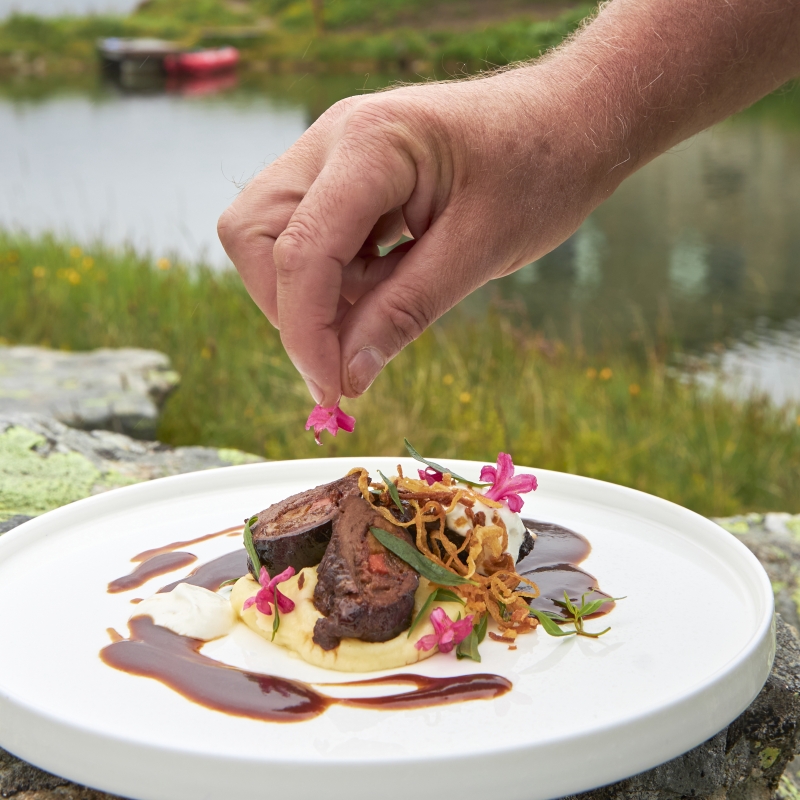 Gunther Döberl sieht in seiner Küche die Alpen als Speisekammer. Dabei ist er fasziniert vom Einfallsreichtum vergangener Zeiten, in denen aus den einfachsten Mitteln die Klassiker der Alpenländischen Küche entstanden sind. Neue Techniken mit den alten Techniken wie Fermentieren, Trocknen, Einwecken und das Verwerten eines ganzen Tieres zu verbinden, ist zur Küchen-philosophie und Lebenseinstellung des Haubenkochs geworden. Für seine Gäste wählt Döberl seine Produkte nachhaltig, verwendet Erzeugnisse aus eigener Land- und Almwirtschaft und arbeitet eng mit regionalen Produzenten zusammen. Seine größten Auszeichnungen: 4 Hauben (17 Punkte) im Gault&Millau, 4 Sterne (94 Punkte) im Guide A la Carte, 3 Gabeln (92 Punkte) im Falstaff Restaurantguide. Sein Küchenstil: regional und alpin mit Pfiff. Sein Schwerpunkt: Die moderne Interpretation bäuerlicher Traditionsgerichte. Sein Gericht für die Heidelberger Hütte: Alpen-Bolognese vom Wild mit Erdäpfelgnocchi