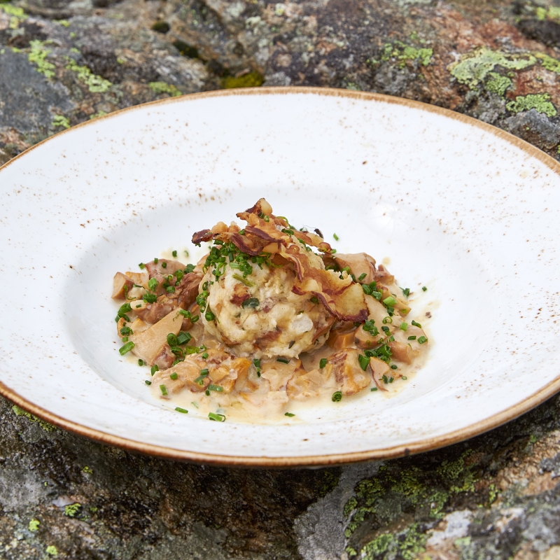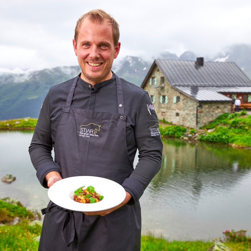 „Jeden Tag besser werden“ ist das Credo von Benjamin Parth. Der Küchenchef im Hotel YSCLA und dem hauseigenen Gourmetrestaurant Stüva in Ischgl ist der aktuell höchstdekorierte Ischgler Koch: Vier Hauben (18,5 Punkte) im Gault&Millau 2020, fünf Sterne (97 Punkte) im Guide A la Carte 2020 und vier Gabeln (97 Punkte) im Falstaff Restaurantguide 2020 sprechen für sich. Höhepunkte seiner bisherigen Karriere: Im Jahr 2009 wurde er im Alter von 19 Jahren mit seinem Gourmetrestaurant Stüva erstmals mit einer Haube (14 Punkte) in der österreichischen Ausgabe des Gault&Millau gelistet. Dazu kommen die Auszeichnung zum „Gault&Millau Koch des Jahres 2019“ sowie die Aufnahme bei „Les Grandes Tables du Monde“ 2020. Sein Gericht für die Fried-richshafener Hütte: Speck-Pfifferlingsknödel