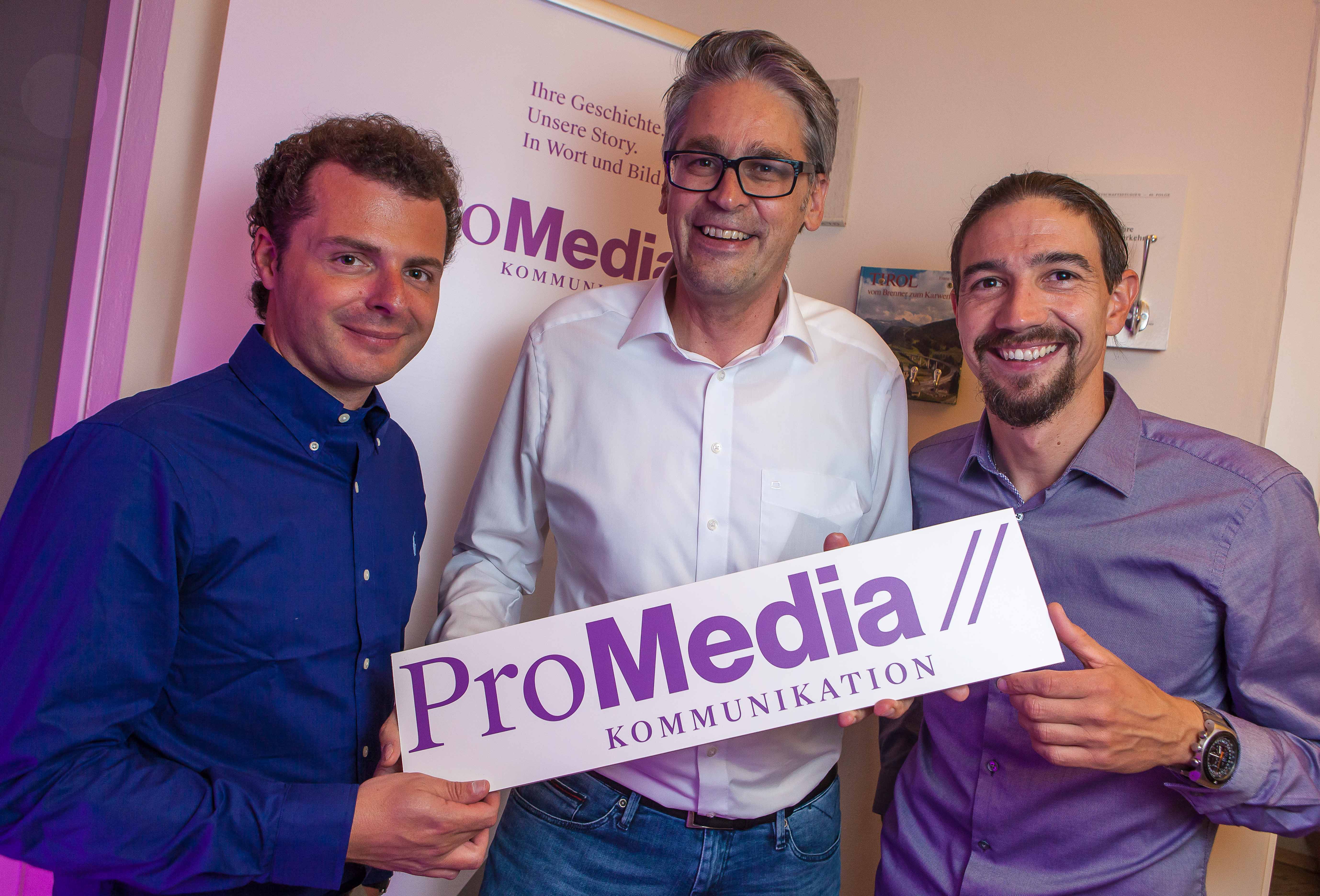 Luden zum Sommerfest in die Agenturräumlichkeiten (v.l.): Filmprofi Emanuel Altenburger mit den ProMedia Geschäftsführern Stefan Kröll und Christian Jost.