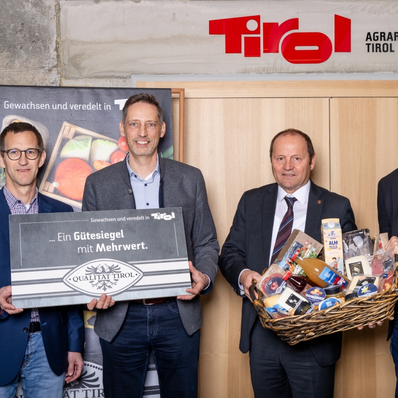Am 31. März 2026 präsentierten Josef Geisler (Landeshauptmann-Stv., 3.v.l.), Matthias Pöschl (Geschäftsführer Agrarmarketing Tirol, r.), Clemens Mair (Geschäftsführer Bauern Produkte Tirol GmbH, 2.v.l.) und Stefan Jenewein (Studienautor Gesellschaft für angewandte Wirtschaftsforschung) die Wertschöpfungsanalyse der „Qualität Tirol“ Produkte im Jahr 2025.