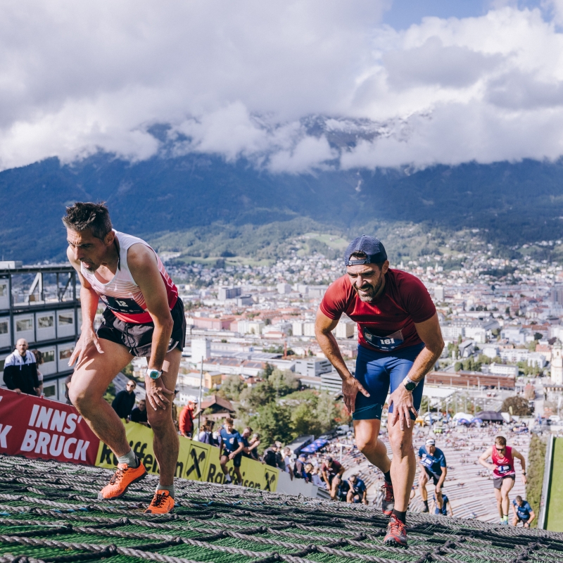 One race that truly pushes both mind and body to the absolute limit is the Red Bull 400. The stage for this ultimate test of toughness and grit is the Bergisel ski jump – but while ski jumpers hurl themselves down the hill, Red Bull 400 racers have to conquer this daunting slope in the other direction: starting from the landing zone at the bottom and working their way up via the jump-off platform and the in-run to the very top. To earn their moment of sporting triumph, contestants have to cover 400 metres in distance and around 130 metres in altitude – not to mention a brutal incline of up to 75%. This extreme challenge calls for strength, endurance, courage and a fighting spirit.