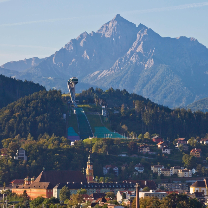 Bis zur Bergiselschanze mit der Serles im Hintergrund reicht der Blick vom Stadtturm aus.