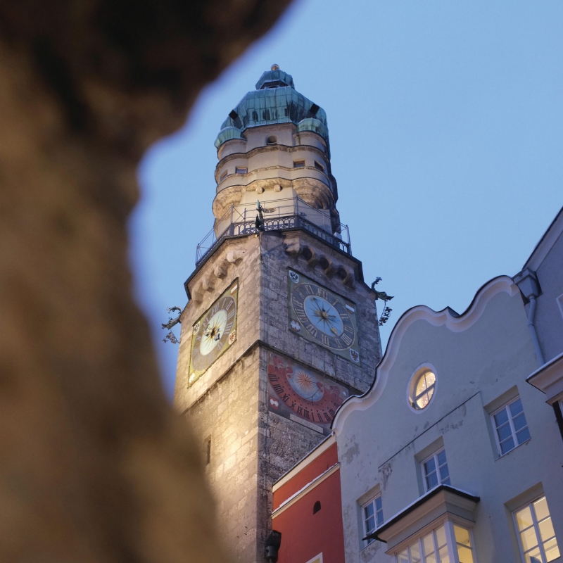 Der Stadtturm Innsbruck wurde in den Jahren 1442 bis 1450 an das Alte Rathaus angebaut und ist somit gut 50 Jahre älter als das benachbarte Goldene Dachl. Im Jahr 1560 bekam der Turm seine charakteristische Zwiebelhaube aufgesetzt und so ragt er bis heute majestätisch zwischen den Altstadthäusern empor. Anfang des 17. Jahrhunderts erhielt der Stadtturm schließlich seine erste Uhr, welche von Erasmus Melchior im Jahr 1603 gebaut wurde. Aber auch heute noch stellt das Bauwerk immer wieder hohe Ansprüche an die heimischen Handwerksbetriebe: In den Jahren 2015 und 2016 wurde der Turm grundlegend renoviert. Während einer ersten Bauphase wurde sowohl das Kupferdach als auch das Mauerwerk restauriert. Ein Jahr später erfolgte die Installation einer elegant geschwungenen Doppelwendeltreppe und die Erneuerung der Brandschutzsicherung.