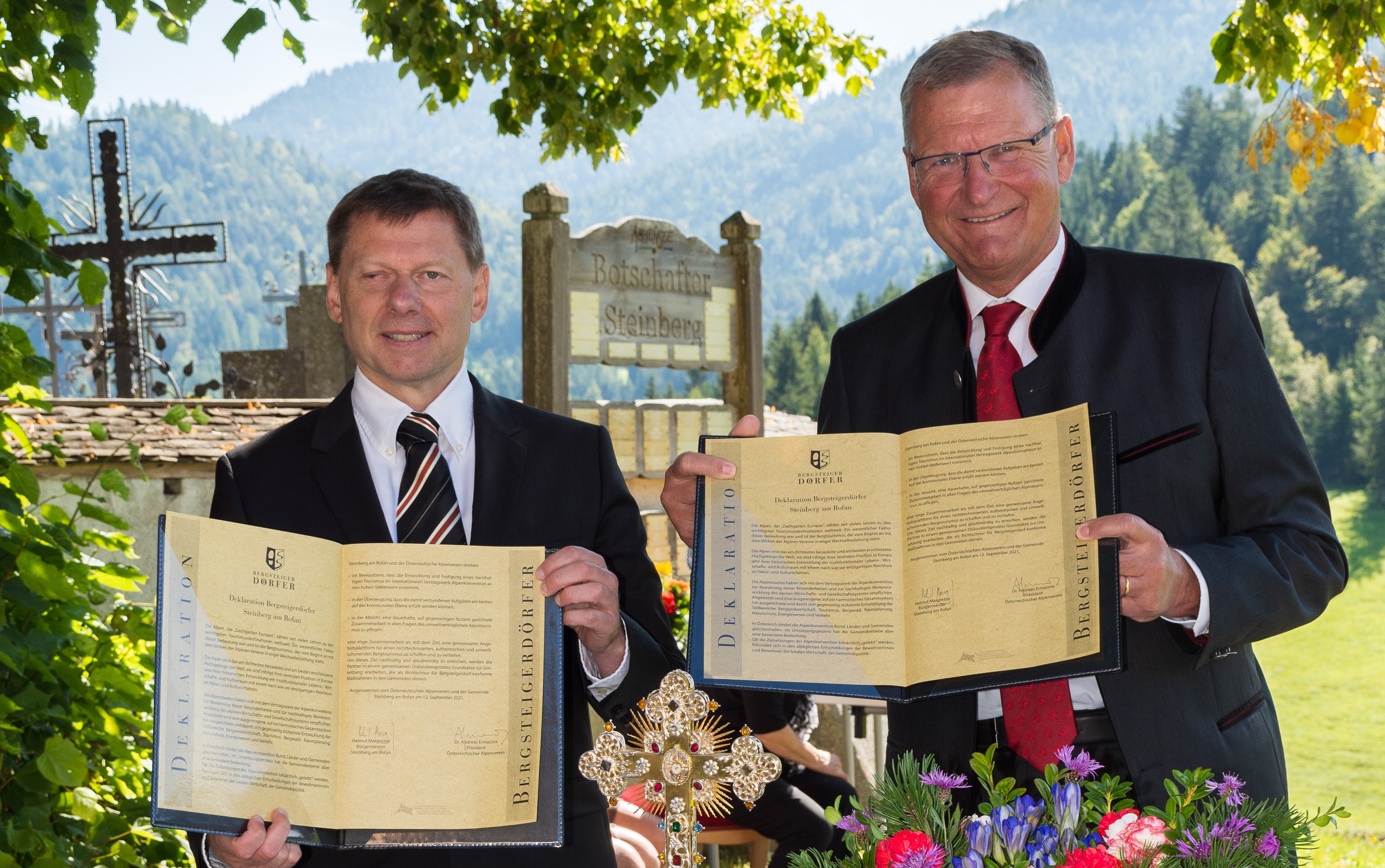 Ausgezeichnet unterzeichnet: Andreas Ermacora (Präsident des Österreichischen Alpenvereins) gratuliert dem Bürgermeister der „kleinen, aber unheimlich motivierten Gemeinde“ Steinberg am Rofan, Helmut Margreiter zur Aufnahme in den Kreis der Bergsteigerdörfer.