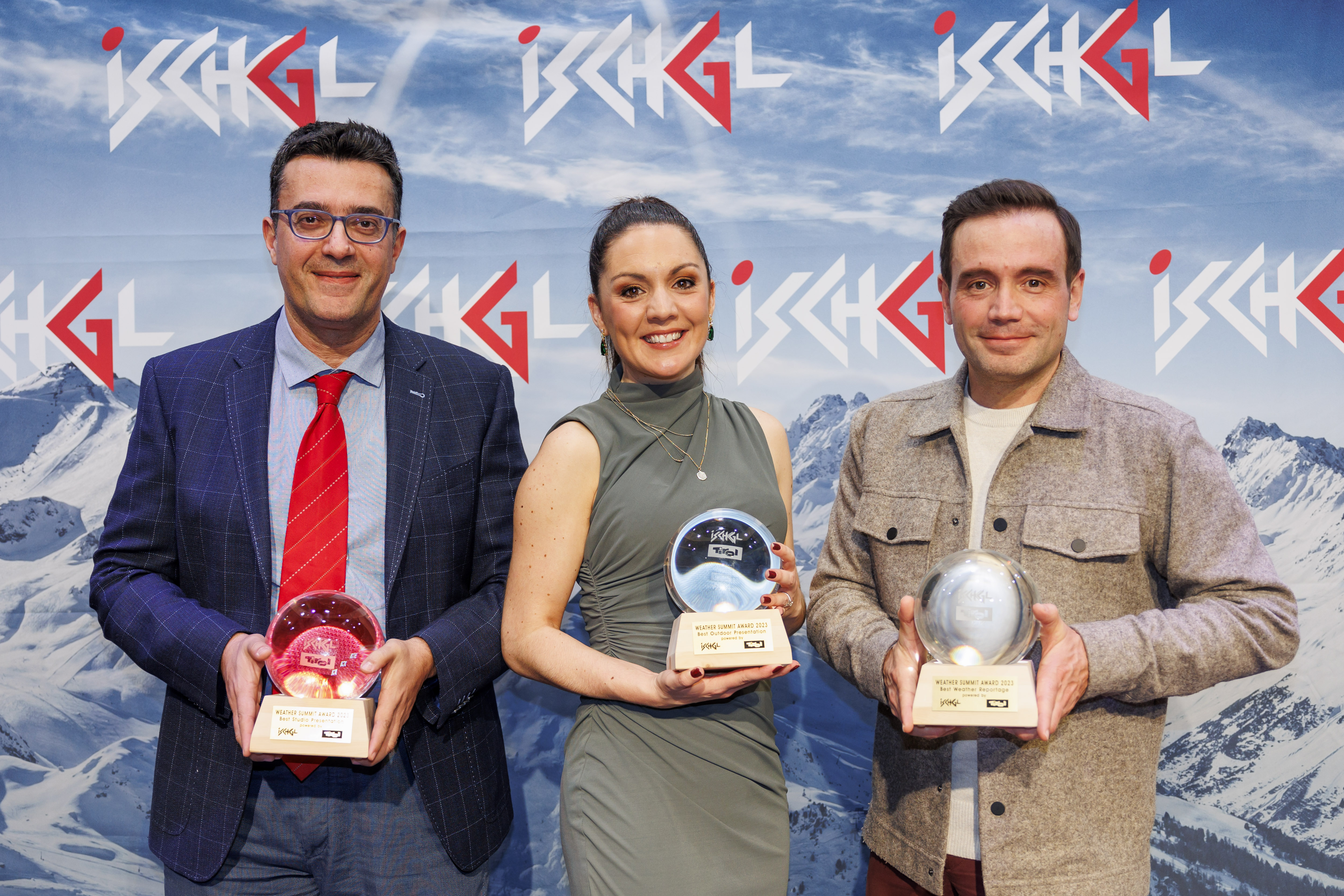 „And the Winners are...“ (v.l.): Panos Giannopoulos (ERT Griechenland, bestes Studiowetter), Laura Tobin (ITV U.K., bestes Außenwetter), sowie Marco Kaschuba (WetterOnline Deutschland, beste Reportage), so die Namen der siegreichen Experten beim 15. Int. Wettergipfel in Ischgl.